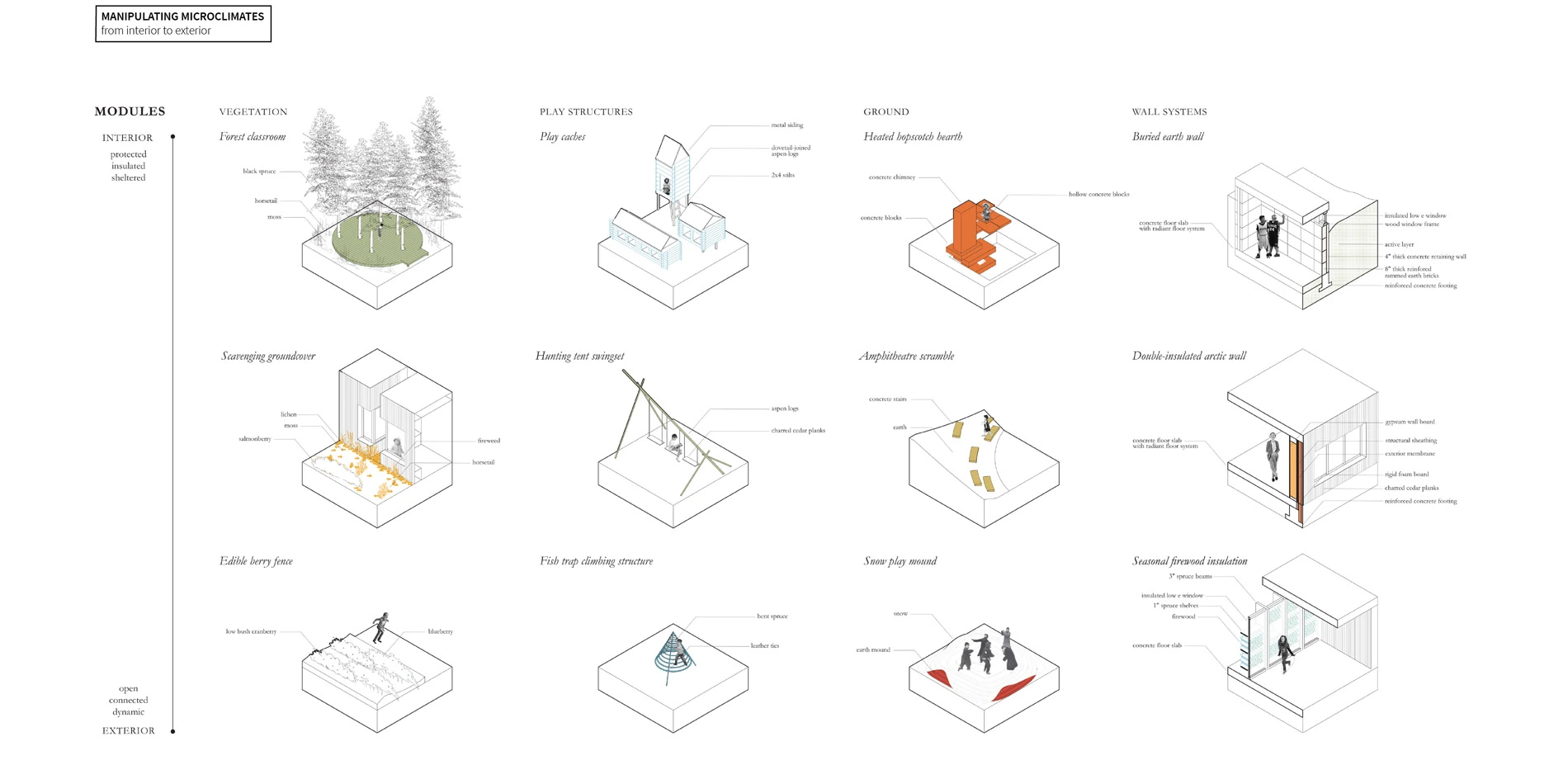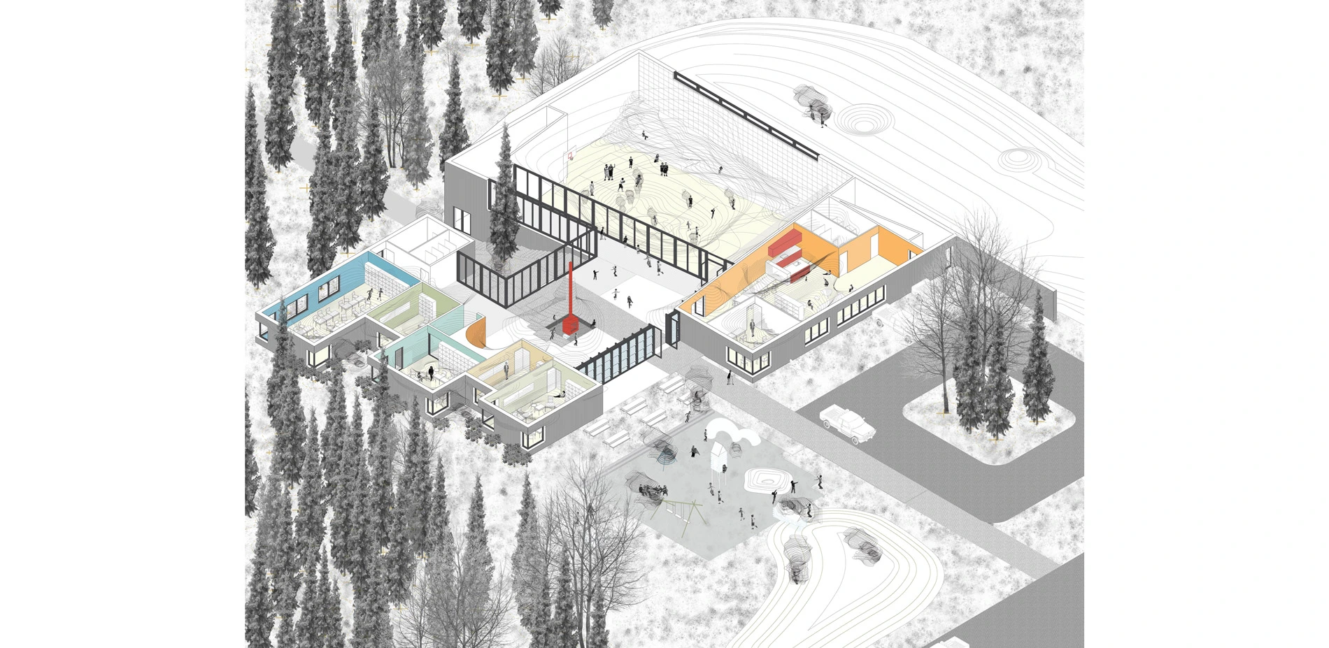 This collaborative project addresses the lack of healthy outdoor and indoor spaces for Arctic inhabitants - specifically children - by developing a seasonally dynamic school in interior Alaska. It is a region of climatic extremes, ranging from -50F to 80F, which has recently generated an architecture solely focused on the building threshold, insulating indoor space from these harsh conditions at the cost of alienated outdoor spaces.