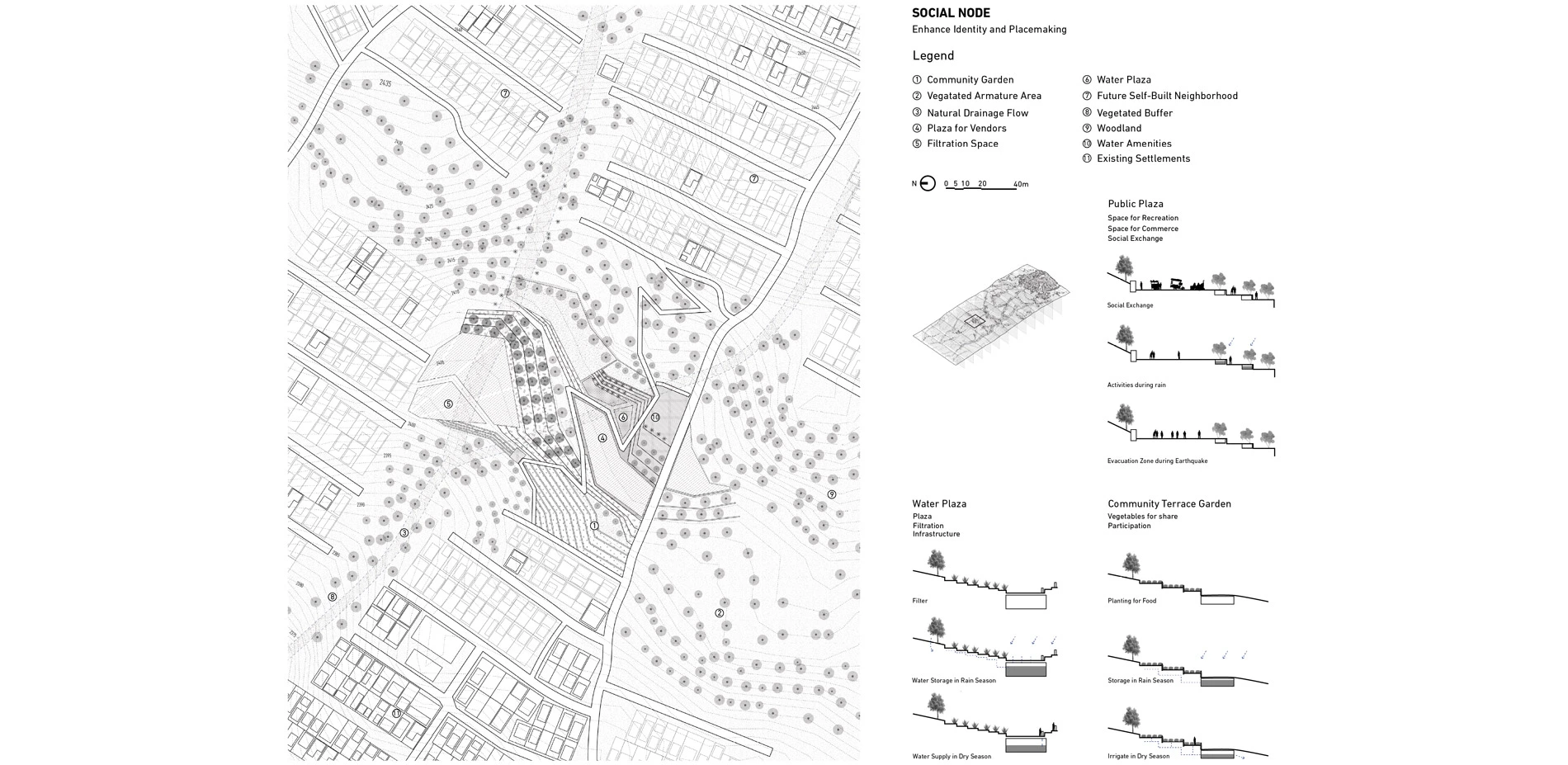 Social Node: It is about social exchange and water infrastructure. It connects lower and upper neighborhoods. It is meaningful to create a social encounter point for residents to meet, share public amenities and it brings new vitality. The underground water tank collects water in the rain season and serves people without water access as a reliable drinking source in the dry season. This supports around 100 families in the dry season, this greatly reduces their dependence on water trucks and donkeys. Another piece of land is terraced to grow vegetables for neighborhoods. Plazas could be used as space for vendors to sell products to promote economic activities, also as an evacuation place during earthquakes. Special plants such as Jacaranda trees are selected to make the space identical and be a place marker.
