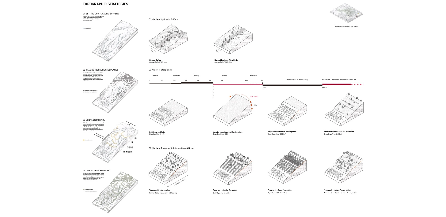 This piece of landscape armature takes simple moves that relate topography, water, vegetation and people, a new topographic urbanization pattern would be created by providing valuable spaces where it can socially, economically and ecologically interact with people.