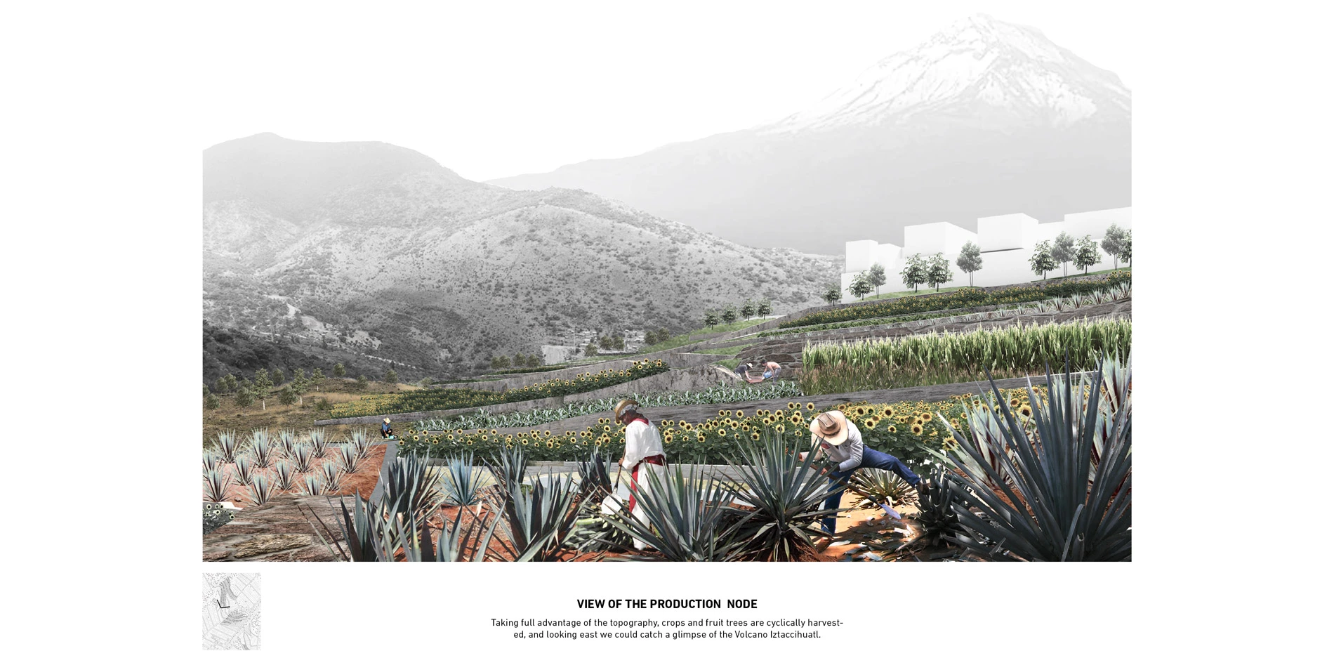 Production Node: It is to reshape the topography and make full advantage of terrace farming, alley cropping and other techniques to conserve water for irrigation. People nearby could utilize the place to get their own food source. Native crops and fruit trees are selected and rotated seasonally. Agave plants make it special and attracts more tourists. Looking west, you would catch a glimpse of the Volcano Iztaccihuatl.