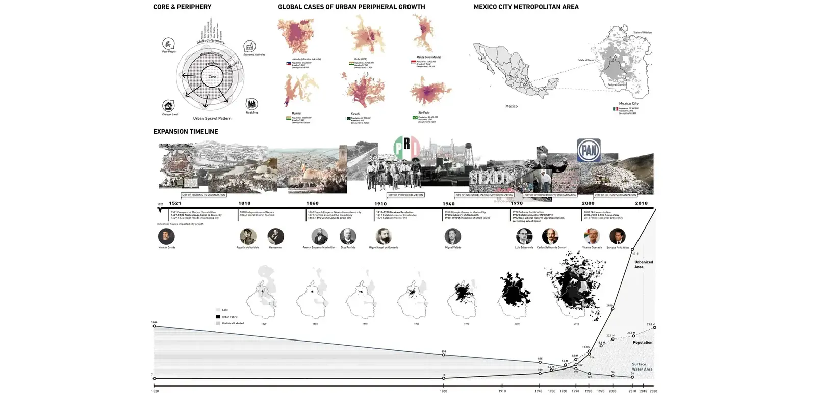What characterizes the periphery rather than the urban core is the sense of insufficiency and incompletion, its as a frontier that serves as border with other places. People move to peripheries in seek of cheaper lands, less congestion and other factors. The majority of urban expansion is happening in metropolitan peripheries of developing countries. In the last 50 years, about 50%-90% of development happened in peripheries. Mexico City Metropolitan Area is one of major cities that has followed similar urbanization path.