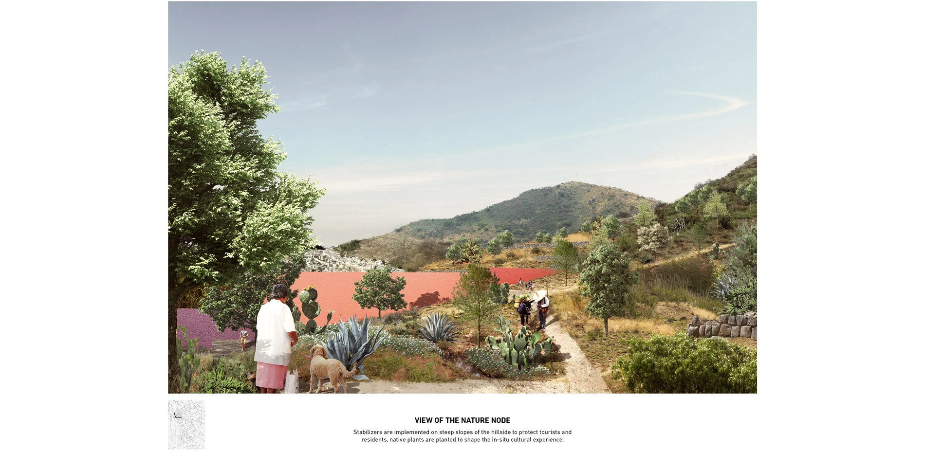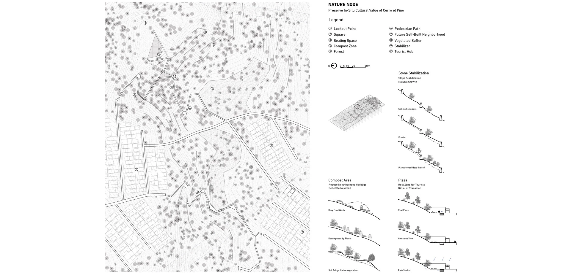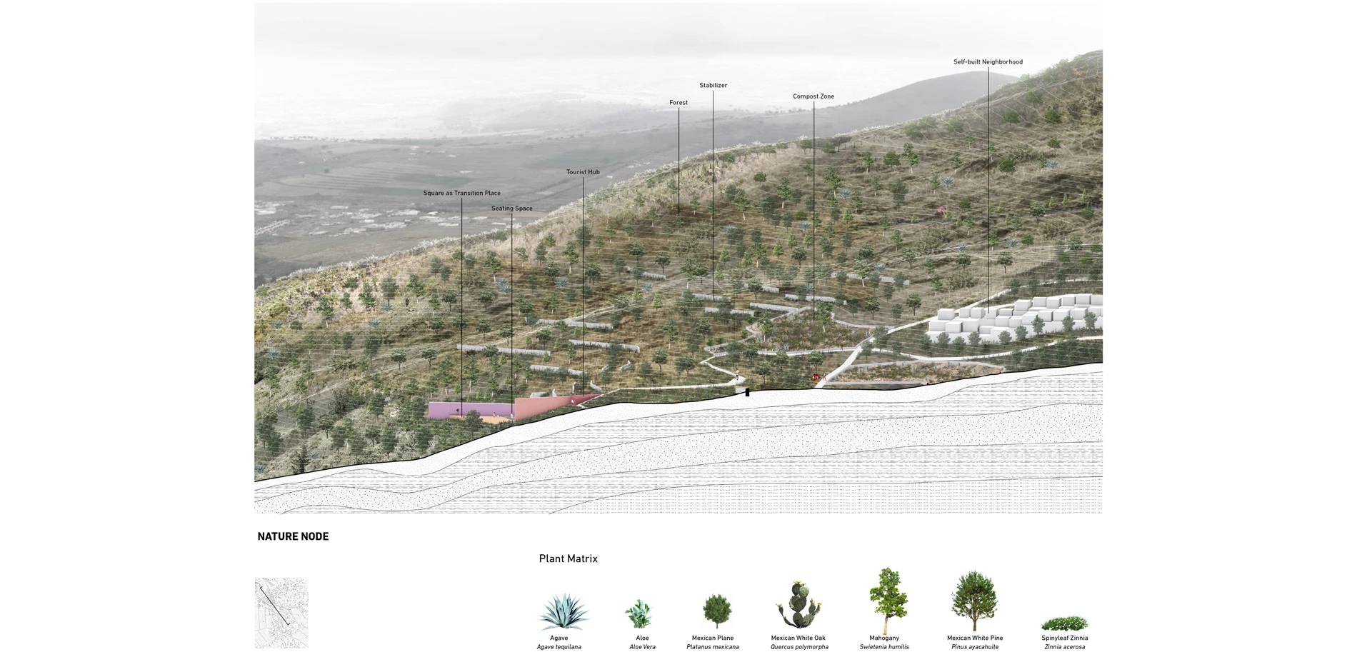 Nature Node: Due to steep slope condition, we use limited interventions like stabilizers to make it safe to connect to the conserved state park on the peak and set up a zone for food waste compost from local neighborhoods. It brings back native vegetation that has been lost in the process of urbanization. Several look out points are set as "ritual of transition" for tourists to rest, contemplate and appreciate the beautiful view of Mexico City. It provides a vivid sample of the Mexican Ecology.