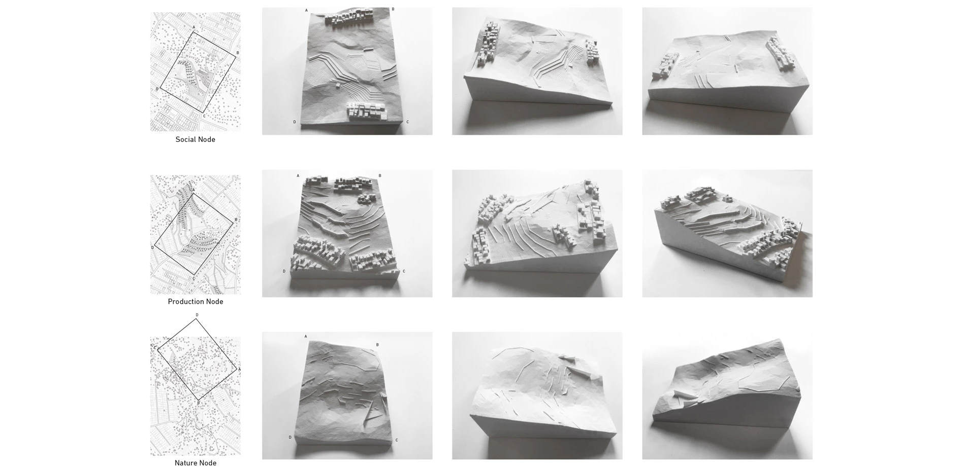 Walking from bottom to peak, sharp different feelings and emotions could be experienced along nodes. These nodes are along intersection points of belts and major roads. Comparing to the current urbanization model, the nodes stores water for 150 families and provides their food, in the meantime conserves the environmentally sensitive and open space.