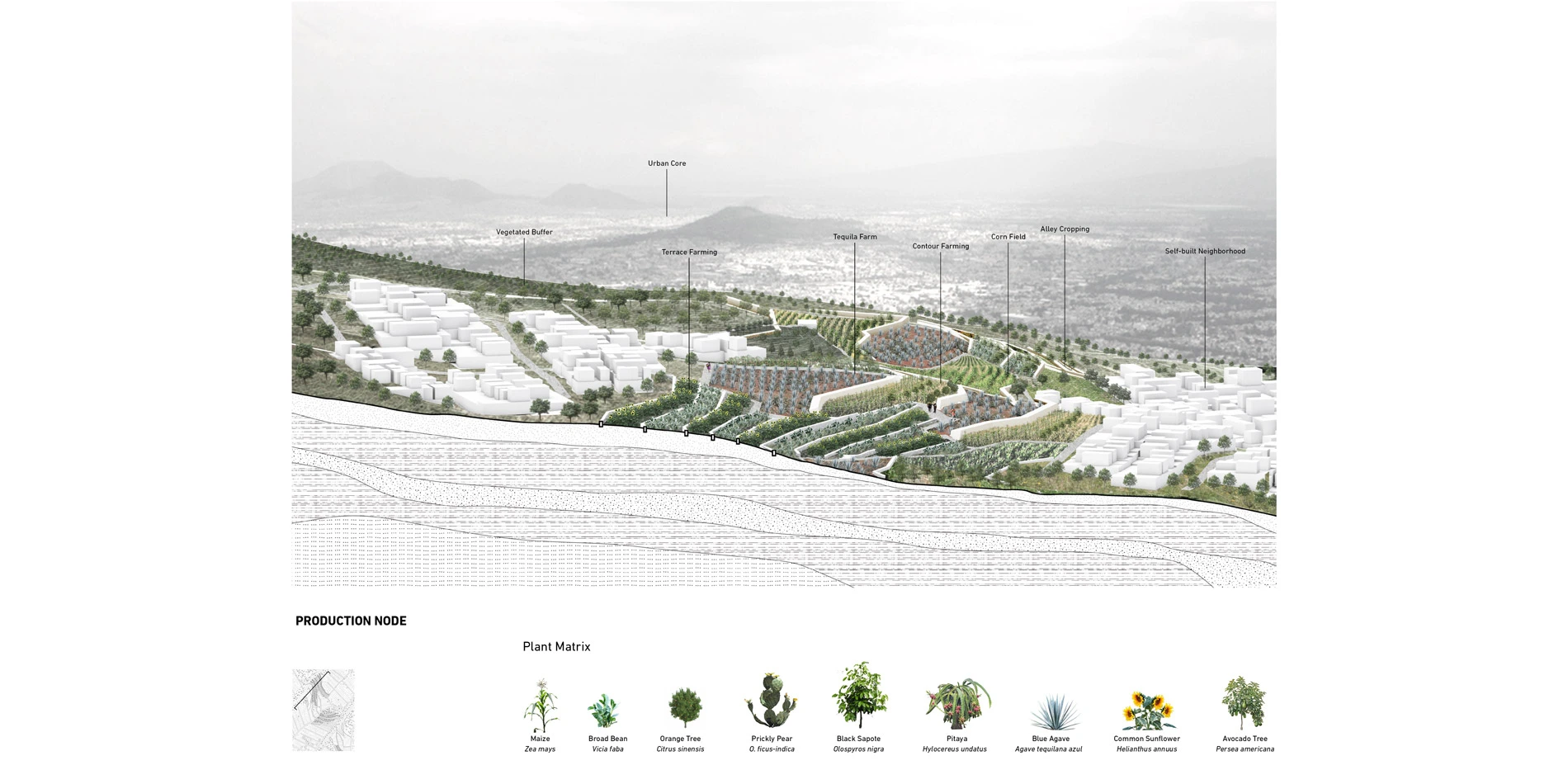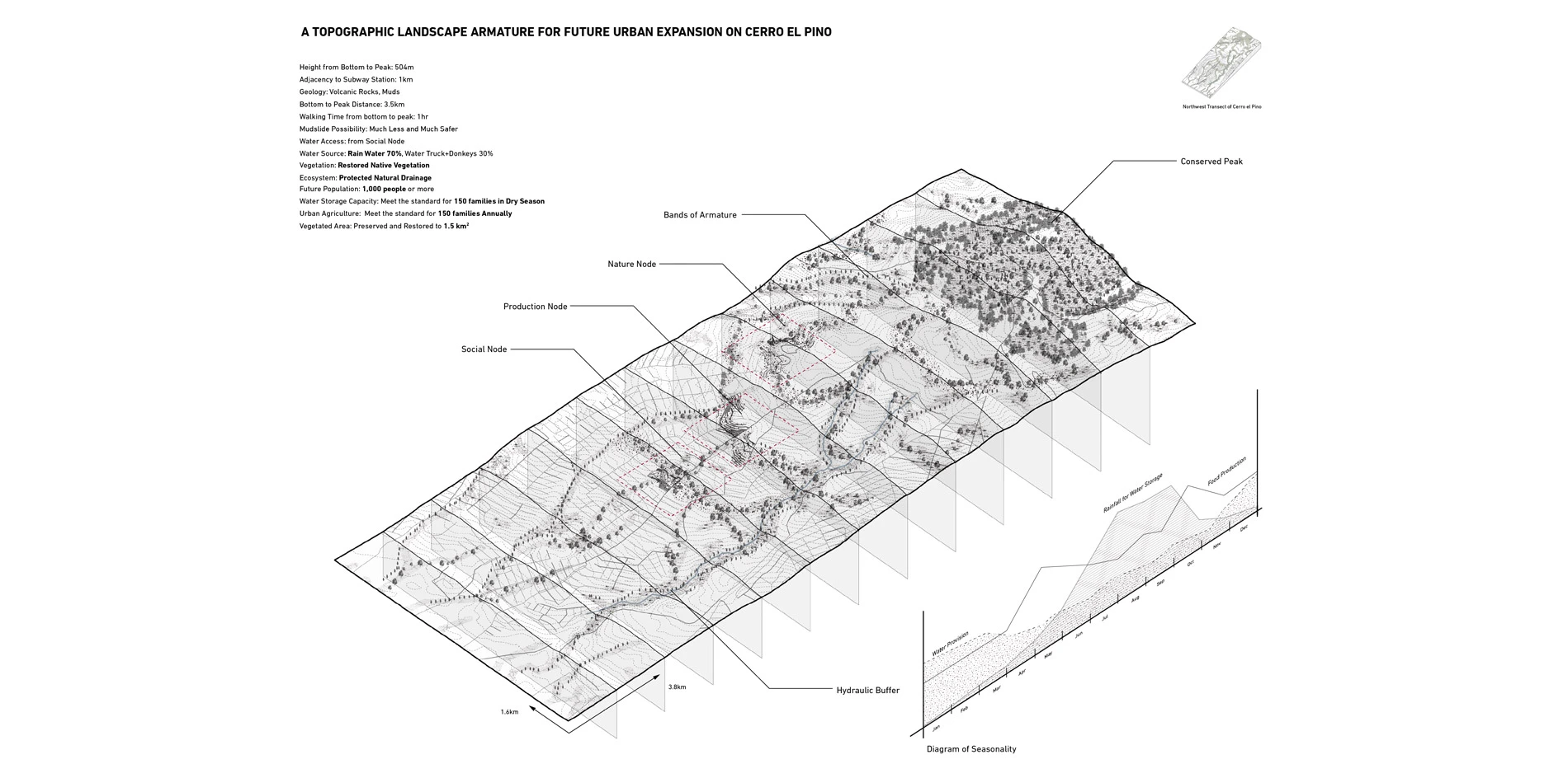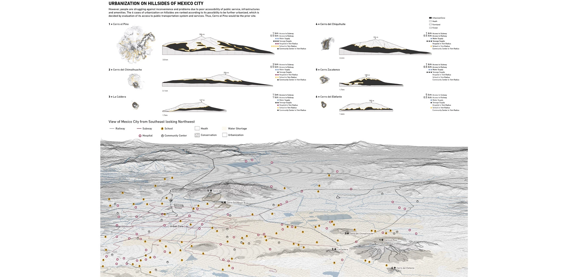 Current informal urbanization pattern lacks infrastructural provisions and open space, which further increases social inequality. This project introduces a pre-emptive approach, a topographic landscape strategy that acts as an open space armature for future development on the hillsides of Mexico City. By connecting and planting hydraulic buffers along steep slopes and introducing topographic interventions in connected bands of open space, the project proposes social, ecological, economic, and cultural amenities that support and sustain the inevitability of informal growth pattern.