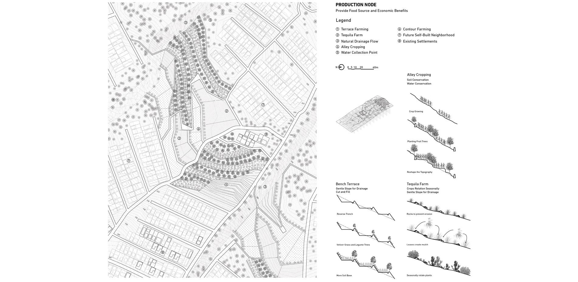 Belts of topographic interventions are set to interconnect large pieces of steep lands and hydraulic buffer zone. It is taken as an open space armature framework. On the one hand they prevent the self-built urbanization by using grading techniques and mass vegetation, on the other hand they protect people from dwelling in unsafe areas. This helps demarcate safe areas where future self-built city can grow, and bring social, agricultural, cultural benefits into the armature. The hierarchy of these bands is related to distance to bottom or peak. Belt in lower part of the hill is with more social function, stores water, purifies sewage and creates public open space. Belts in the middle are more about production. Closer to peak the slope is very steep, and so it is appropriate to make it natural and reduce possible interventions.