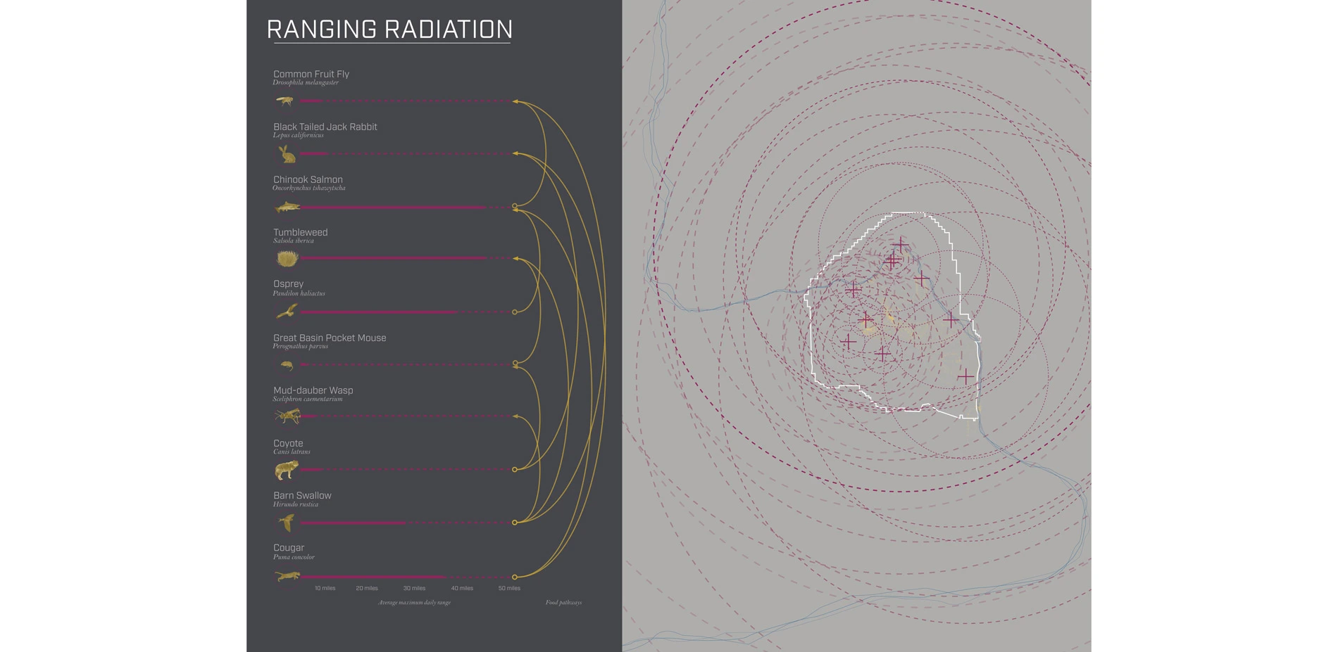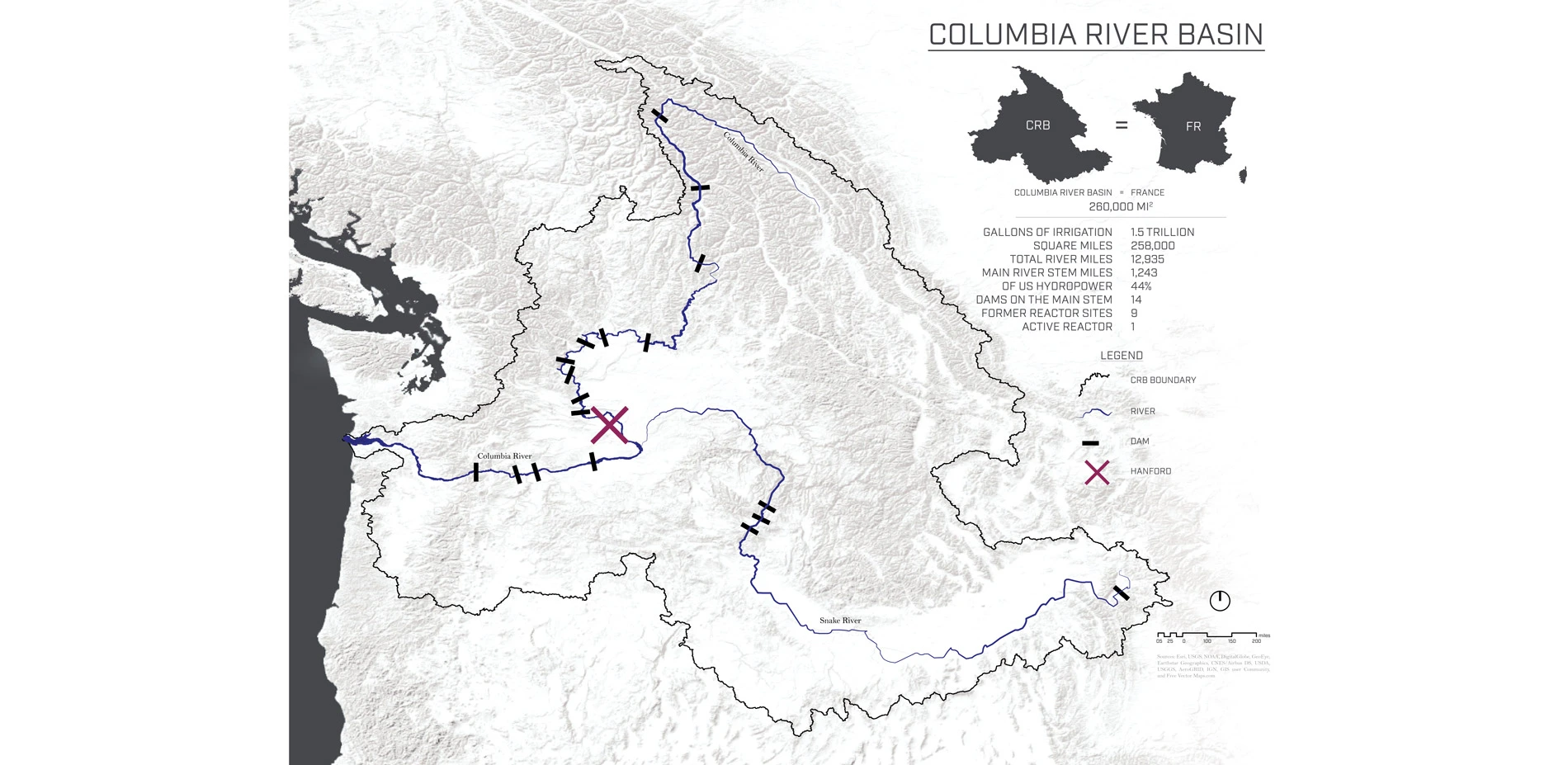 Despite Hanford's pervasive toxicity, large expanses of the site, originally set aside as a security buffer between military operations and civilians, have resulted in unintentional preservation of the largest intact shrub-steppe ecosystem, previously unknown plant species, and the last free flowing stretch of the Columbia River (Gerber 1992). As such, Hanford presents a strange paradox of conservation and toxification: seemingly wild and open yet also meticulously surveilled and irredeemably toxic (Cram 2015). The juxtapositions of toxicity and wild, open space at Hanford prompted an investigation into processes of territorialization, land use, and legibility that challenge dominant narratives and provoke new thinking about ecology, heritage, and design.