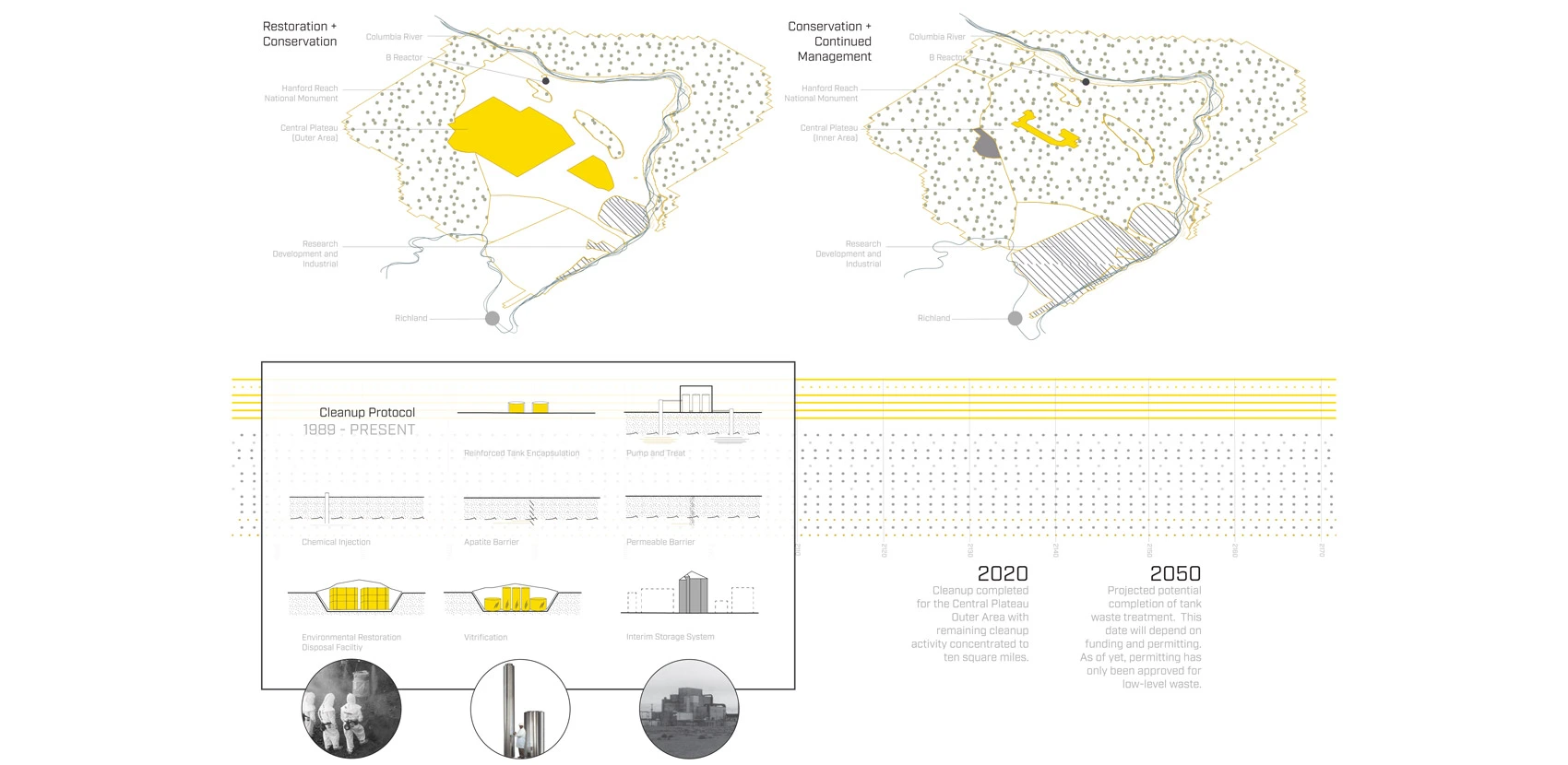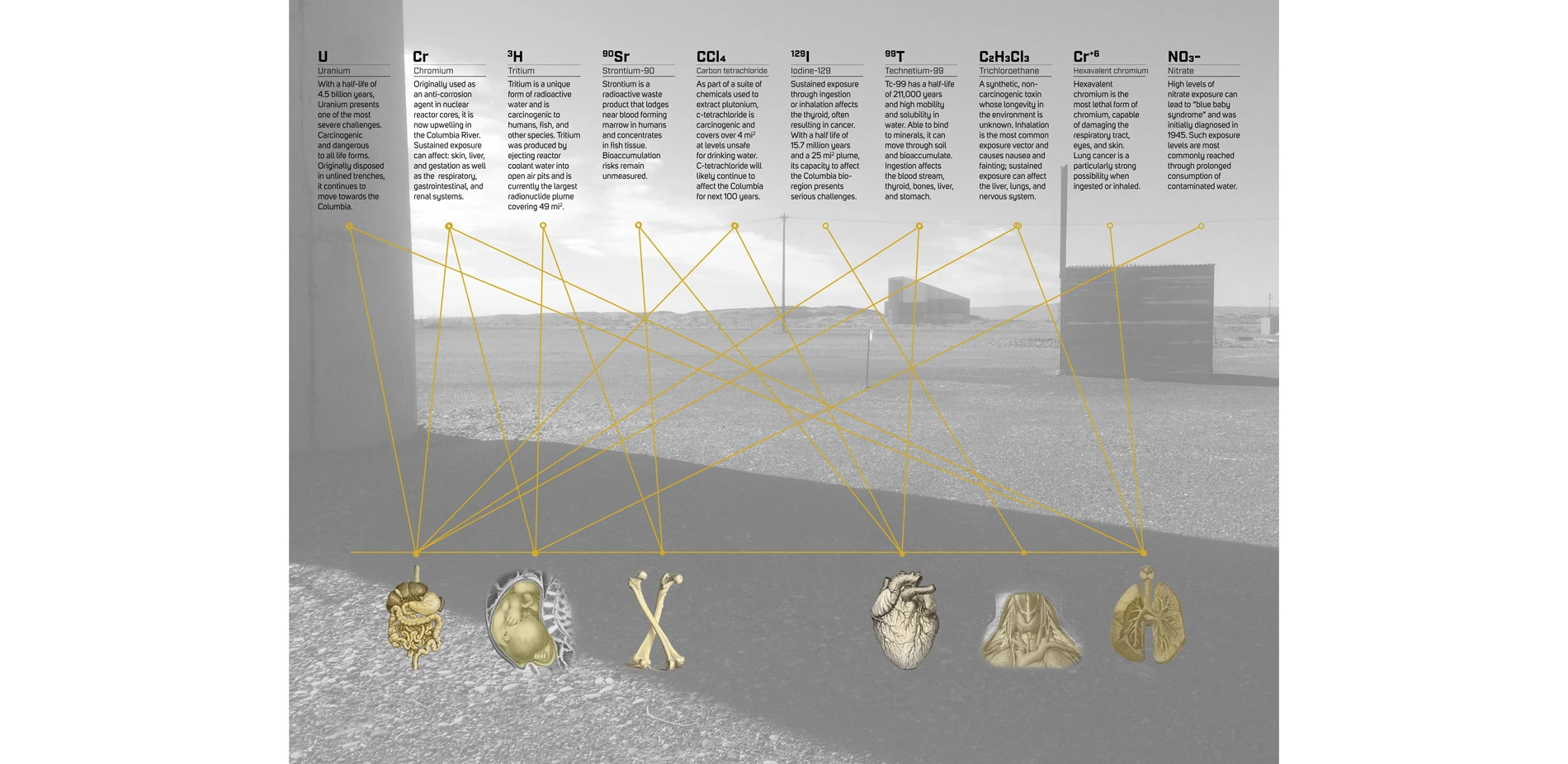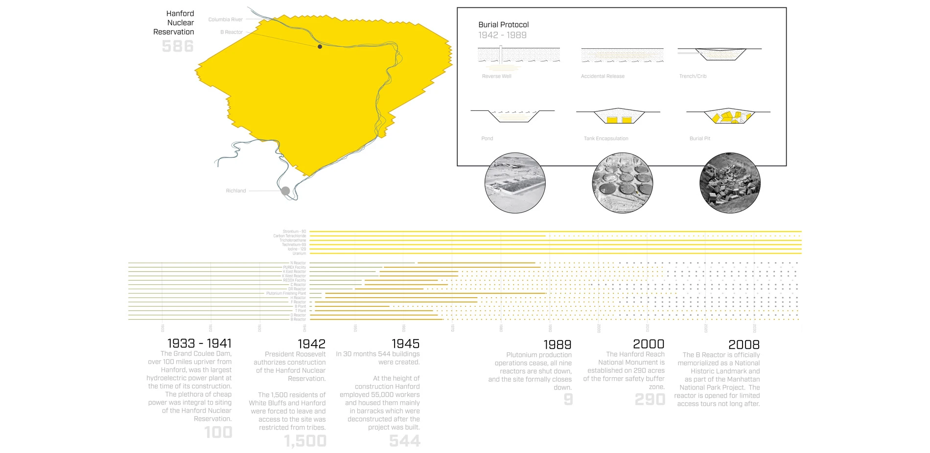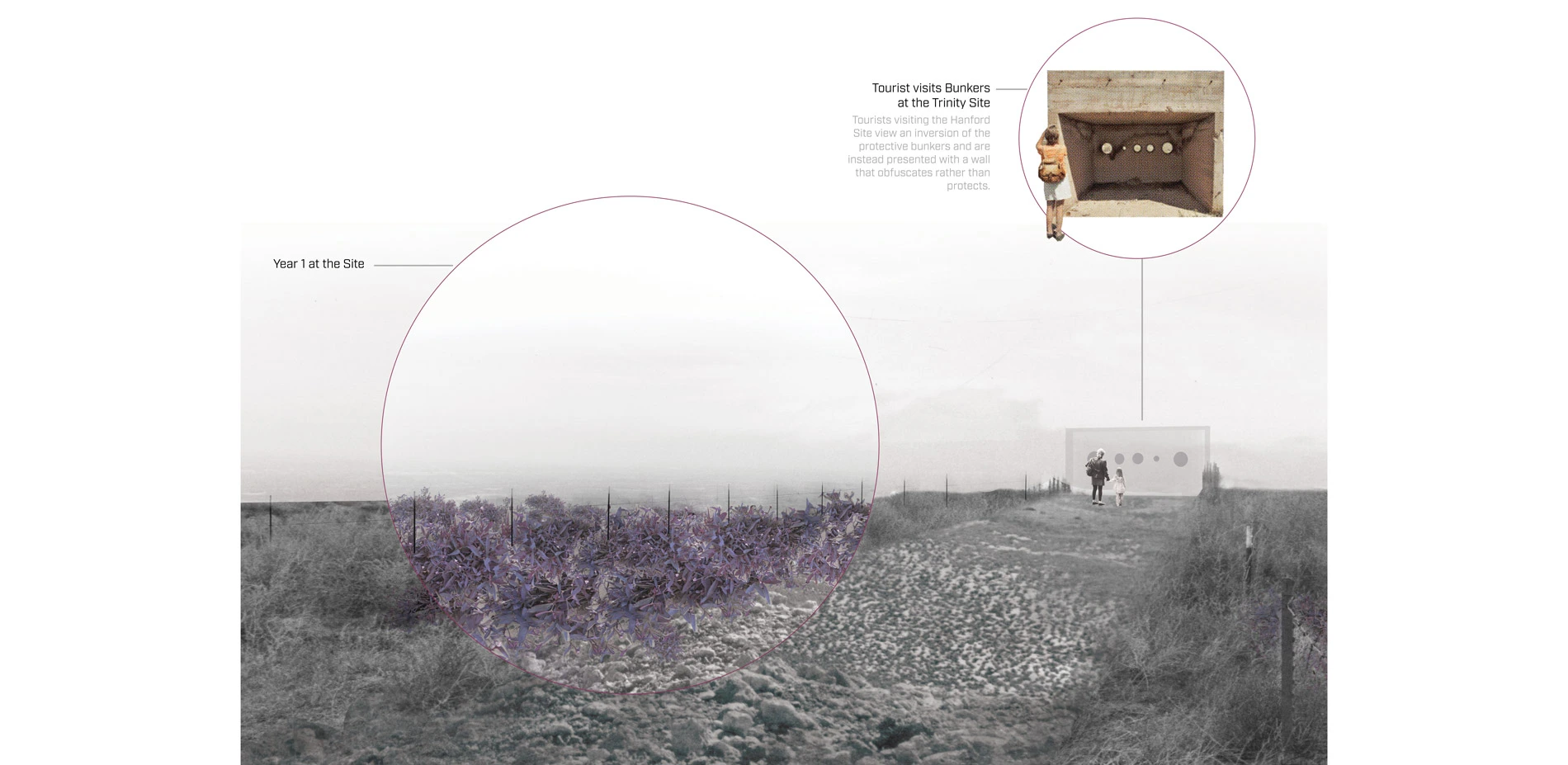 The ongoing consequences of nuclear weapons and waste will continue to impact the world in ways that cannot be ameliorated or erased. Design should engage the public with landscapes of waste as a way to reveal the unconfined impacts of reconfiguring landscapes to produce power through territory and narrative. These proposed interventions do not focus on the scientific and engineering accomplishments of Hanford essential to the heritage discourse of the DOE and NPS, but on the exploitive, extractive, and environmentally degrading military-industrial operation that has created a legacy within the landscape that will last for hundreds of thousands of years.