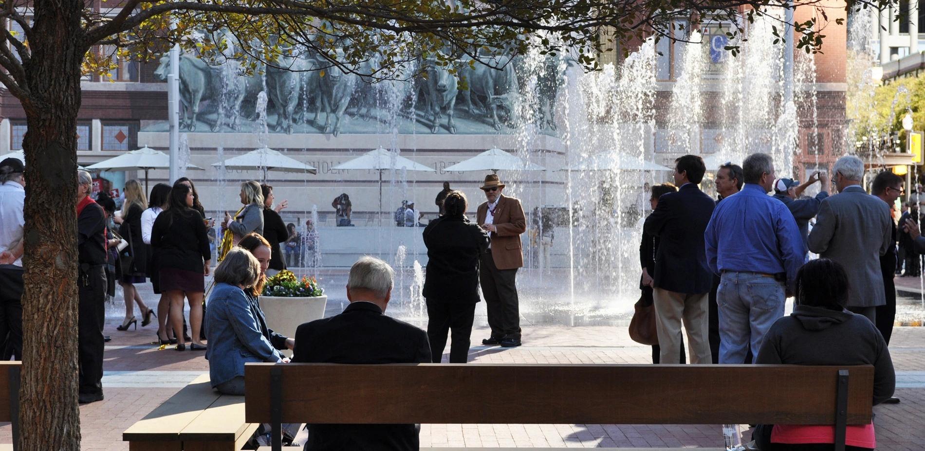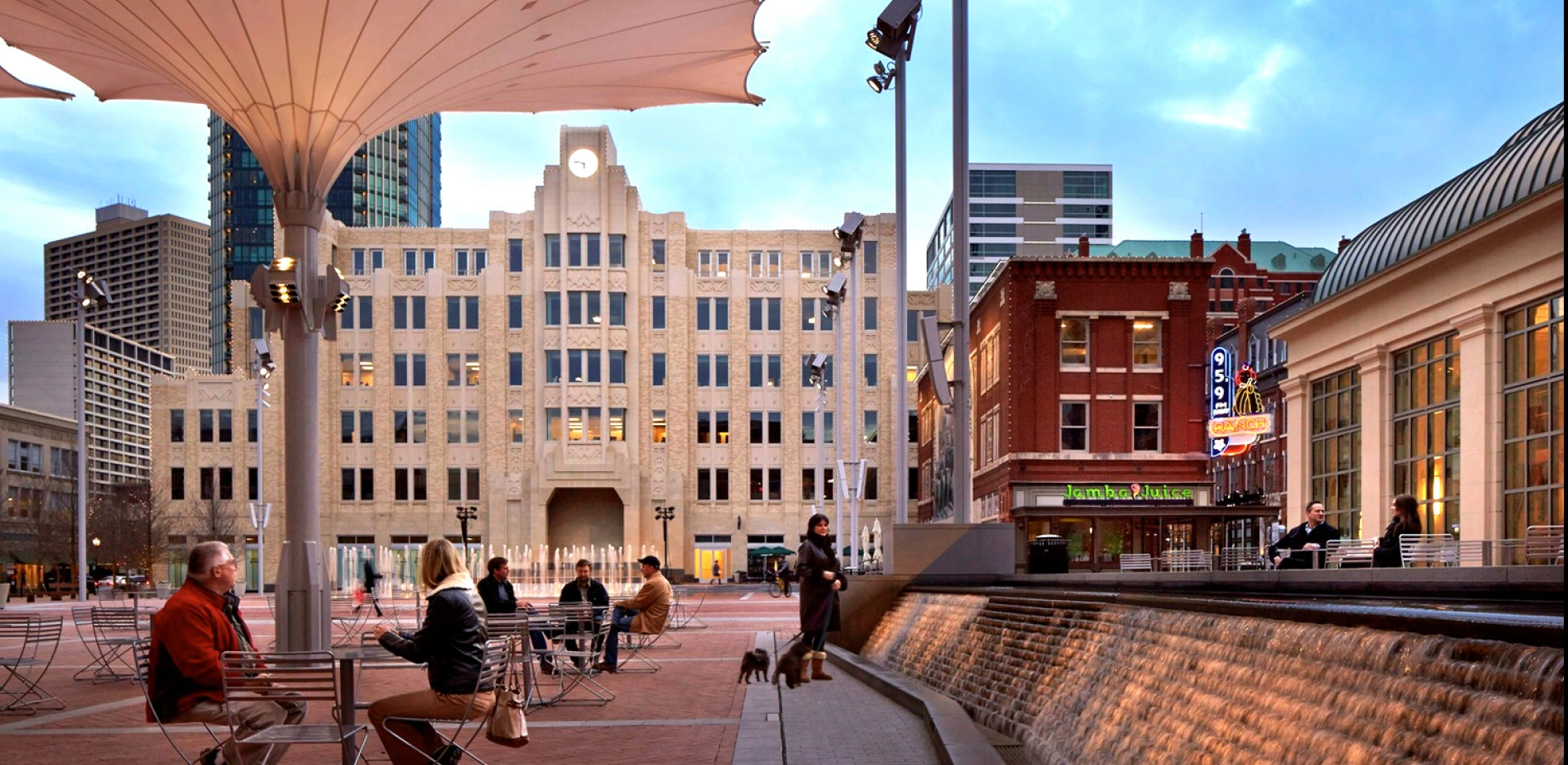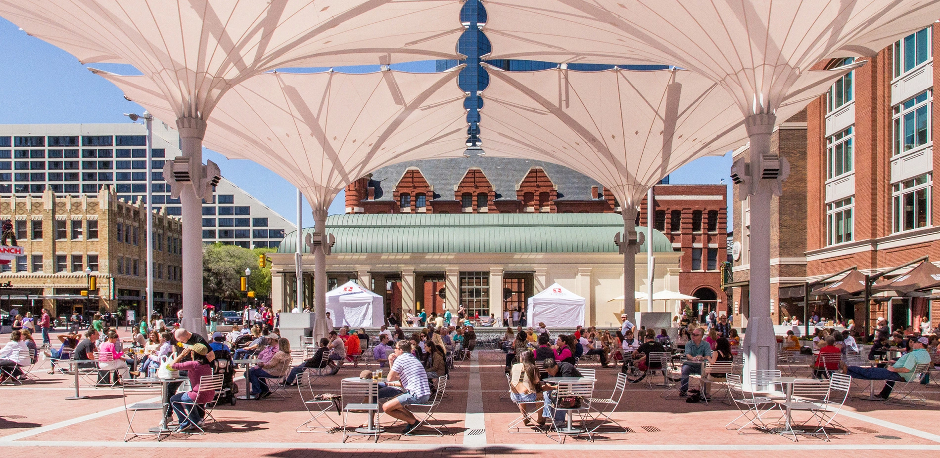 Texans are famous for a charismatic hospitality that blends traditional values with a genuine good time. Fort Worth's Sundance Square Plaza is a prism for this practice at a large scale, a place where everyone can feel at home. The former parking lots on Main Street welcome thousands of visitors weekly to a dynamic tableau nestled within the rich architectural detailing of the city. Equally welcoming on a peaceful morning or a lively evening, the Plaza's water and light form the backdrop for public life. Its interactive fountains and giant, operable umbrellas provide opportunities to play and relax unlike any other in the surrounding area, complementing a diverse community program that revels in everything from daily exercise to festive annual celebrations. Forming one of the safest, cleanest, and most walkable areas in the city, this spirited social hub is known as the Heart of Fort Worth.