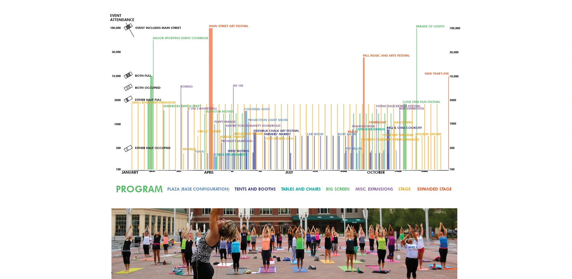 To ensure high performance on any occasion, the design team developed several integrated options for program modification. Designing for this degree of flexibility requires precision and restraint. Ramps were graded to seamlessly address the site's 4-foot north to south drop, and site furniture and fixtures are either collapsible, portable, or embedded in the floor system. Careful coordination was undertaken to integrate functional needs with a paving pattern that resembles a woven carpet, in which clay tones complement the historic Thurber brick on Main Street.
