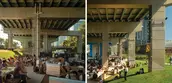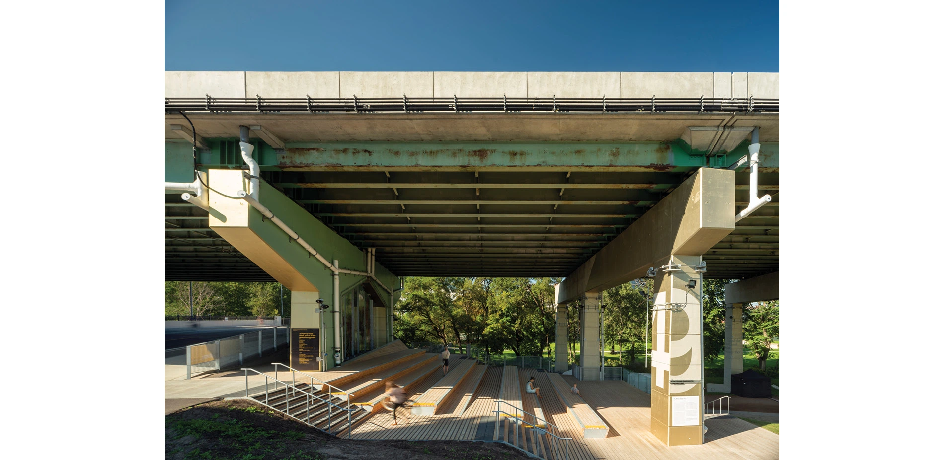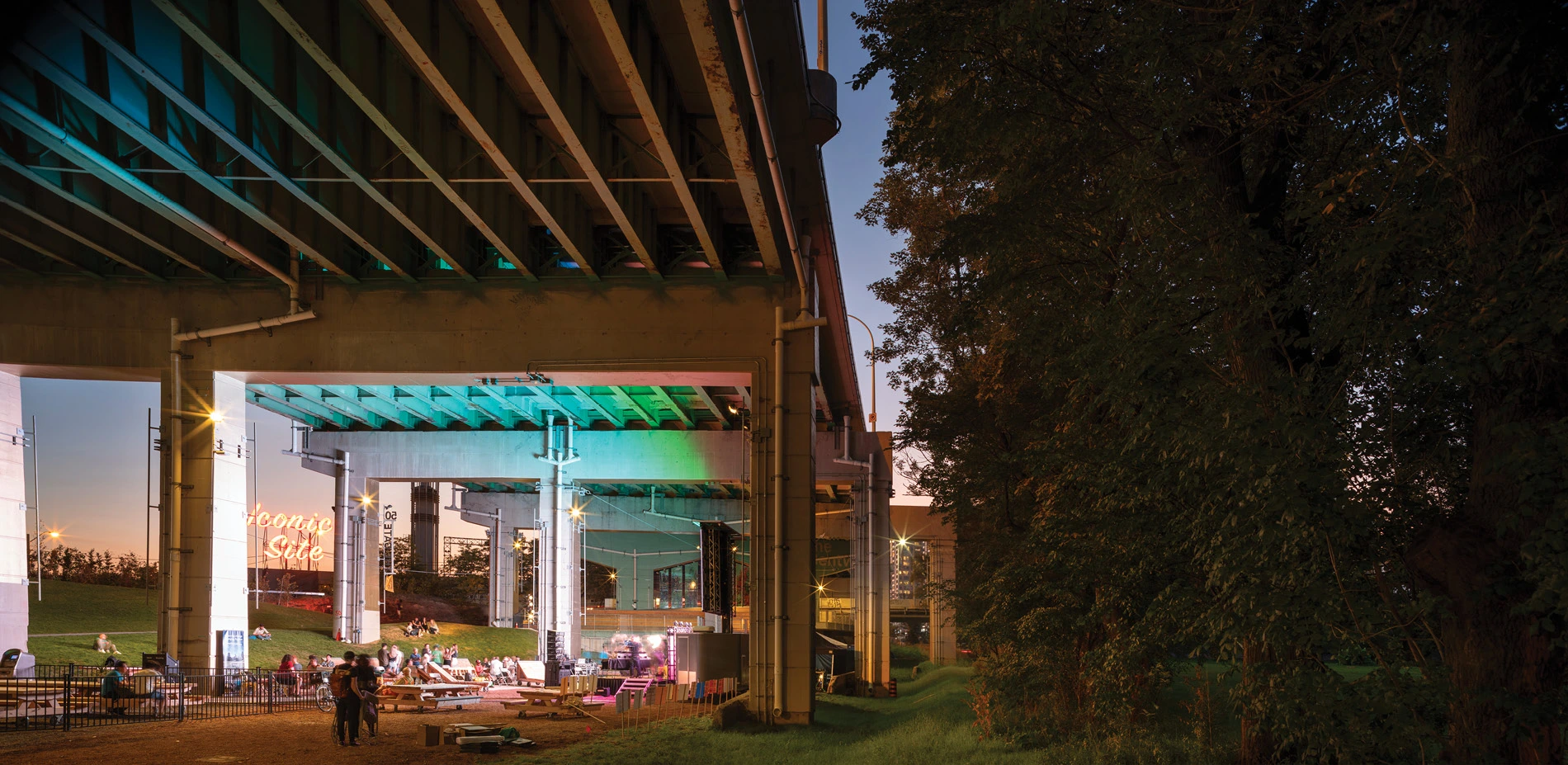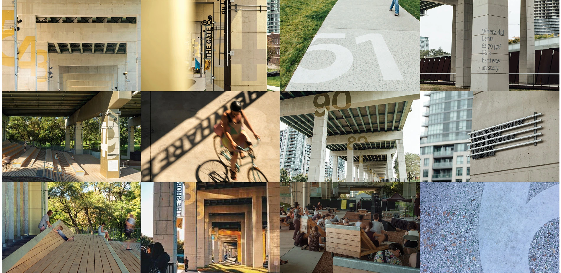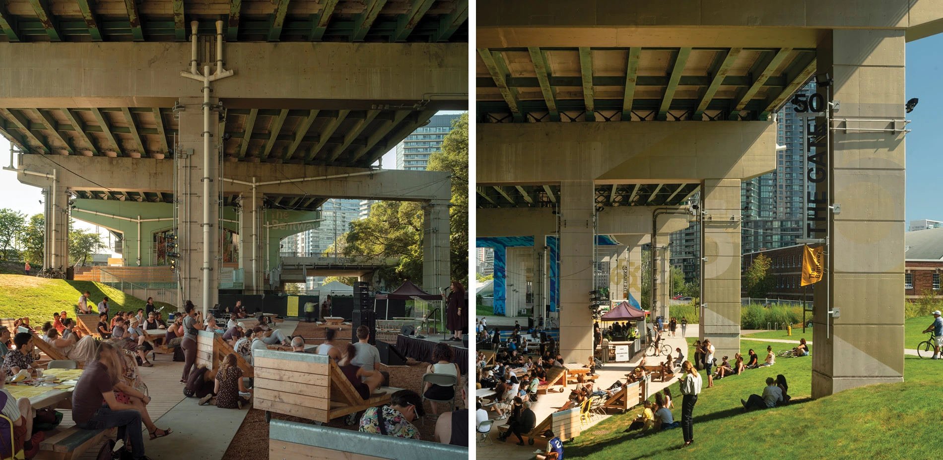 The project stitches together seven neighbourhoods, expands access to key areas such as Fort York National Historic Site and the Central Waterfront, and creates a new gathering place for Toronto's growing population. The starting point for conceptualizing the project was the structure itself. The expressway's series of supportive concrete columns - "bents" - create a series of 'civic rooms' that can function collectively or on their own to offer spaces for a diverse range of programming, events and public life. The underside of the expressway, varying in height from intimate to a majestic 15-metres, is re-cast as a metropolitan-scaled piece of public equipment with the bents offering structural support for clamps, cables, power and lighting to support everything from day to day public life through to large scale community or civic gatherings.