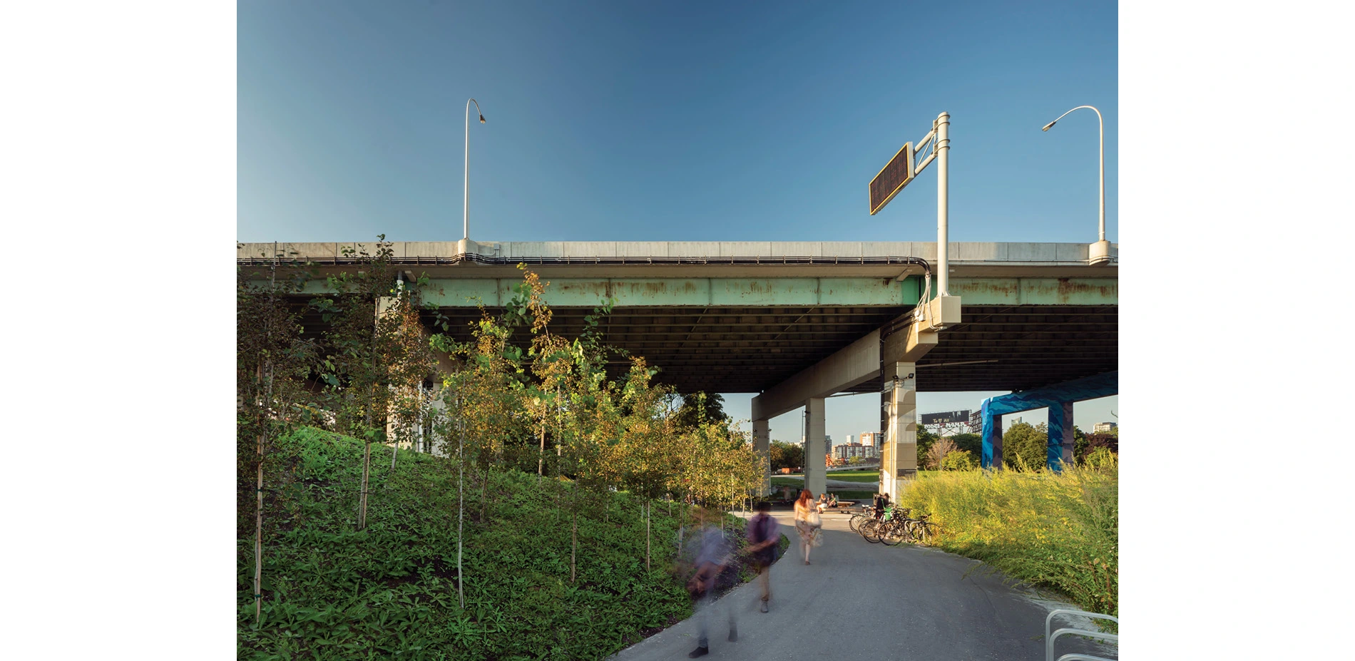 The surface below the expressway is transformed as a continuous, flexible ground plane, knitting together public and private land, facilitating movement with new a new trail, treating stormwater and repurposing displaced soil to establish a new topography upon which a landscape is cultivated to recall the historic shoreline. The project's materiality demonstrates resourcefulness and an overall desire to apply the lightest touch to achieve the greatest impact. For example, the paving system focuses on showcasing recycled materials including embedded construction debris retrieved from the Leslie Street Spit – a lakefill site that has received demolition materials from Toronto's construction activities over the last 50 years. The numbers on the concrete columns, originally marked for repair purposes, are reinterpreted for wayfinding, cast into the path and painted on the bents with reflective paint that catches the daylight. Each material is reflective of the spirit of place and conveys the rich layers of Toronto's built history.