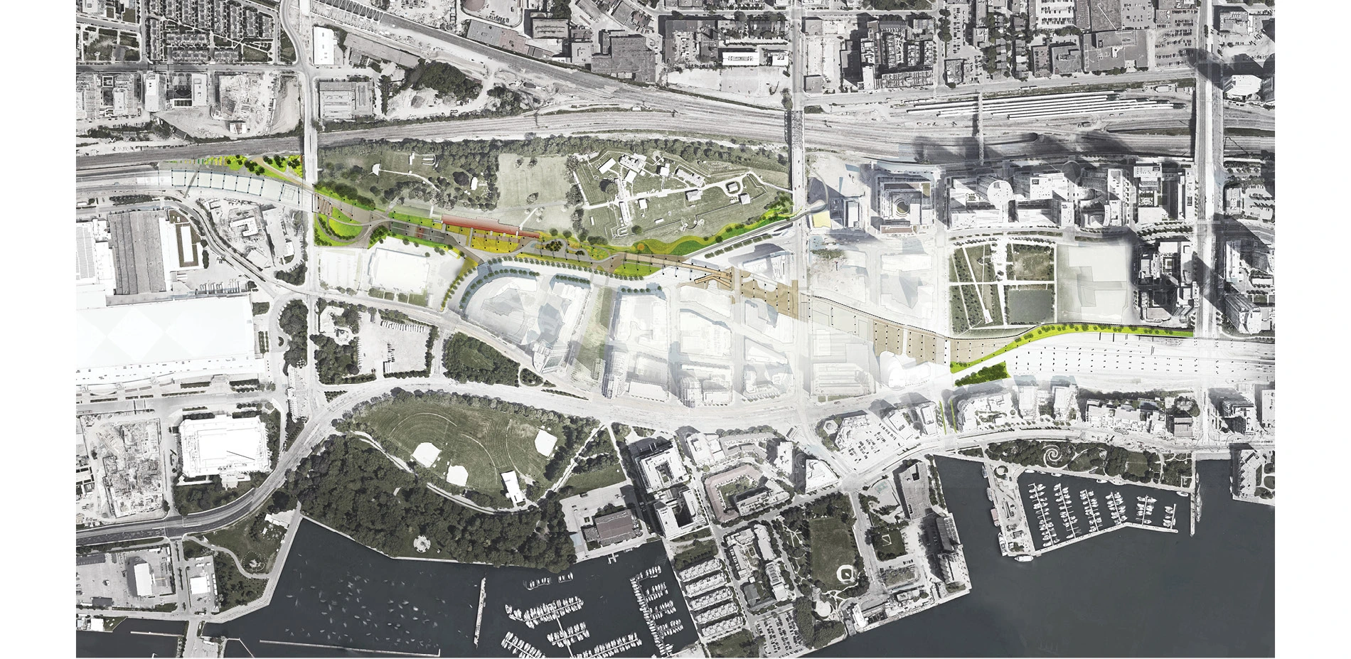 The starting point for conceptualizing the project was the structure itself. The expressway's series of supportive concrete columns - "bents" - create a series of 'civic rooms' that can function collectively or on their own to offer spaces for a diverse range of programming and events. The underside of the expressway is re-cast as a metropolitan-scaled piece of public equipment while the public spaces and trail stitches together seven neighbourhoods, expands access to key areas such as Fort York National Historic Site and the Central Waterfront, and creates a new gathering place for Toronto's growing population.