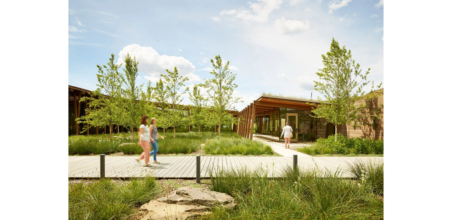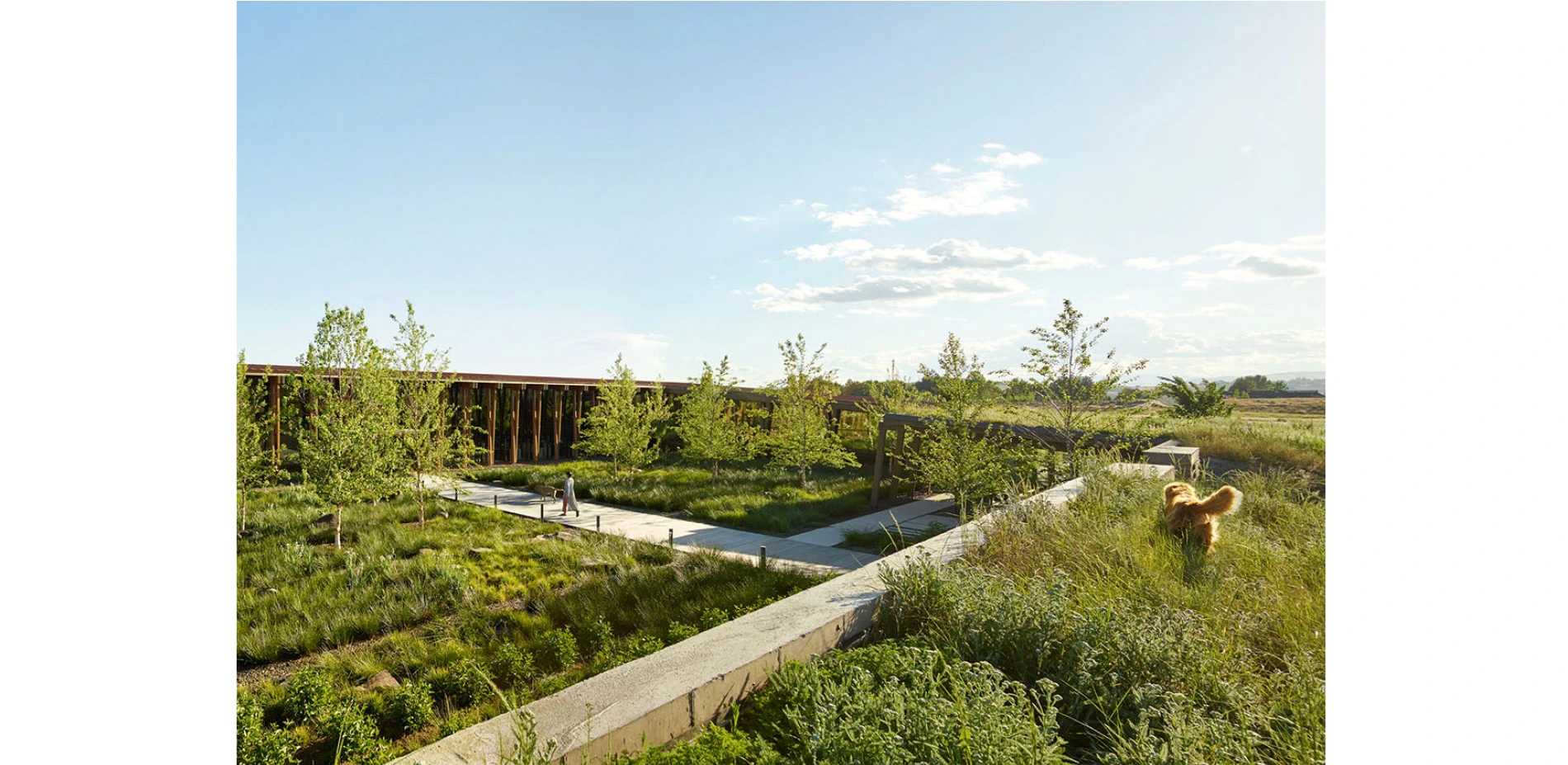 Native species from the nearby riparian corridor and the surrounding hillsides demonstrate their beauty and ability to adapt to a managed landscape. The planting recalls both natural patterns and the ordered row planting of the site's agricultural past. A reminder of some of the first ornamental trees planted in the valley, non-native but culturally significant DED-resistant American elms and sugar maples, provide shade for the parking areas. Native Rocky Mountain Iris bloom in the early summer adding a surprising pop of purple and blue.