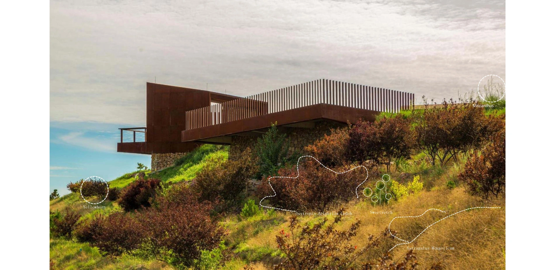 Design ContextYellowhorn is a native species that thrives in harsh desert climates, stabilizes soil, retains moisture, and provides oil-rich seeds. At this project site today, the yellowhorn farm spans 150 acres and has begun to attract immigration and boost the local economy. This farmland has been also integrated within a greater wind energy program supplying renewable energy for both farmlands and local villages. The project was initiated by the Yellowhorn Exhibition Center and Aohan County government in 2013. The concept is to commemorate the work that has been done to combat desertification on the Mongolian plateau, exemplify the transformation from desert to commercially viable farmland, and promote the vitality of local villages through the landscape. A series of public meetings with local governments, communities, village residents, farm employees, and scientists in the agriculture, geology, ecology, and humanities fields gave this project a true sense of place that connects it with the heritage, spirit, and attitude of those battling desertification.