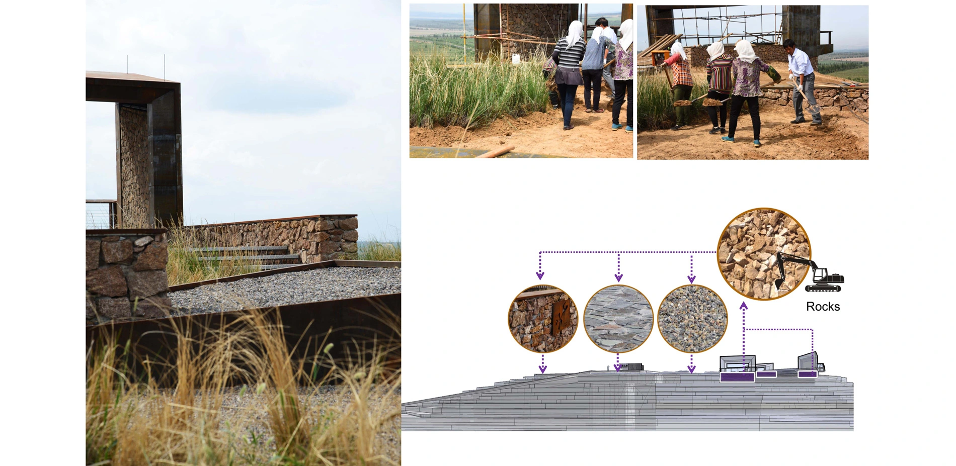 Eco-friendly Construction and LandscapingThe landscape architect mined elements from the local site, including excavated rocks and soil, abandoned planting machinery, and local natural plants; these were repurposed in the new landscape structure and pavement. The recycled agricultural machinery elements from the yellowhorn farming and natural rocks excavated for construction add historic character to the landscape. To build a resilient landscape in this cold, dry, and windy climate, we took our cues from the local drought-tolerant house construction method that uses cyclopean masonry with rammed mud and natural stones, and planted native species (sea-buckthorn, miscanthus, and yellowhorn) around or in the structures. This six-month landscape construction process involved no professional construction teams, but rather used only local resources and village residents.