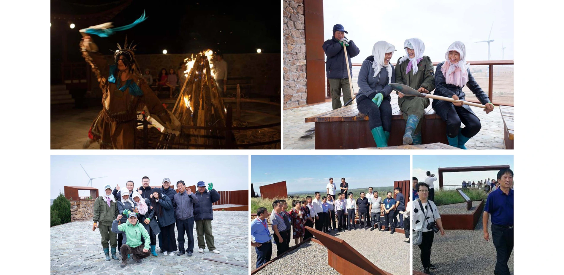 Multi-functional UseThe basic functions of the landscape structure include memorial, recreation, education, photography, nature watching, resting, and village events. The distribution of open spaces, public stages, social places, and amenities reflect the mobility, flexibility, and cultural interaction that define this contemporary use and certain traditional cultural activities, such as Mongolian dancing and singing. Also, some specifically designed display structures with traditional signs and patterns were integrated into the open spaces for potential exhibition, memorial, and educational events. The routine programs held in this landscaped area, part of the Yellowhorn Exhibition Center, involve national summit meetings of yellowhorn businesses, classes and summer camps for regional schools, and a great quantity of public visitors.