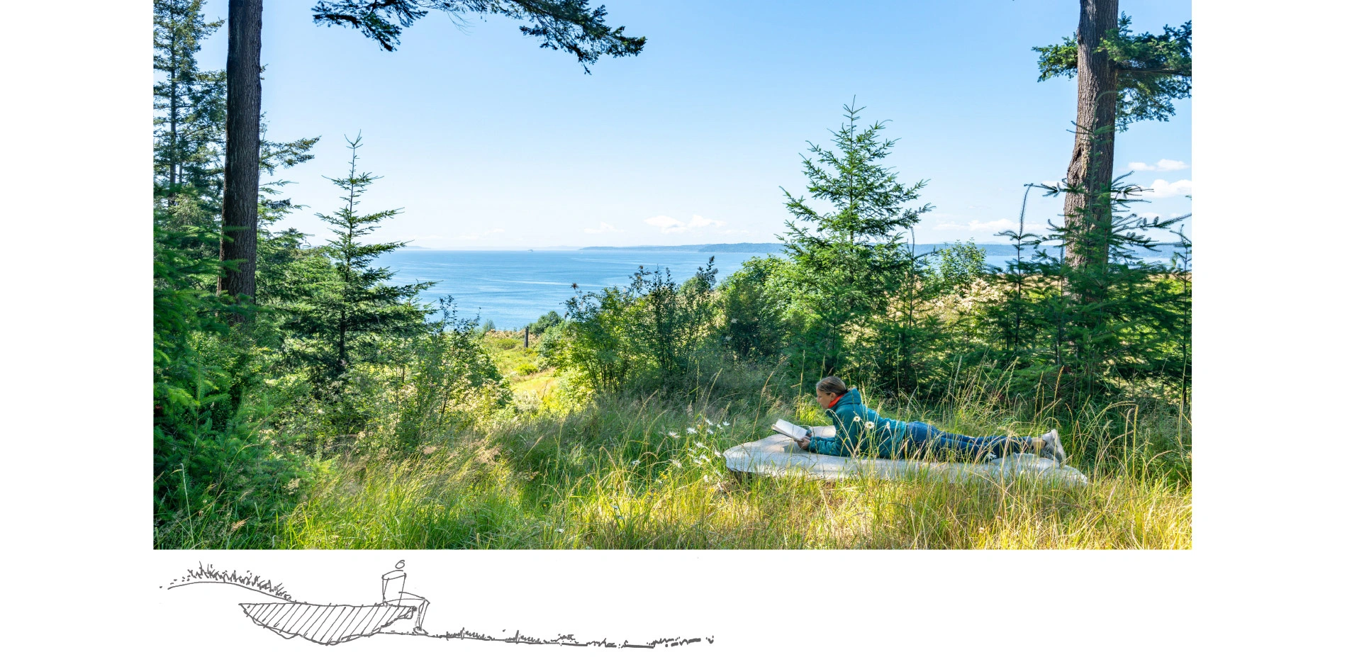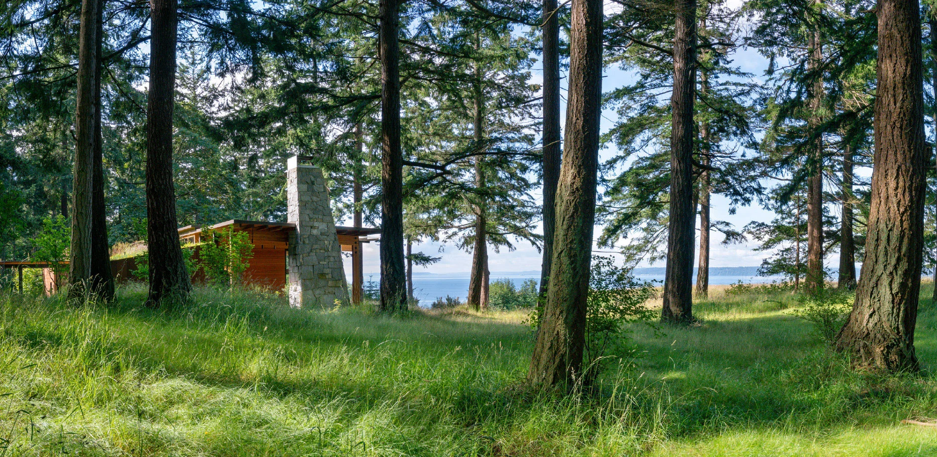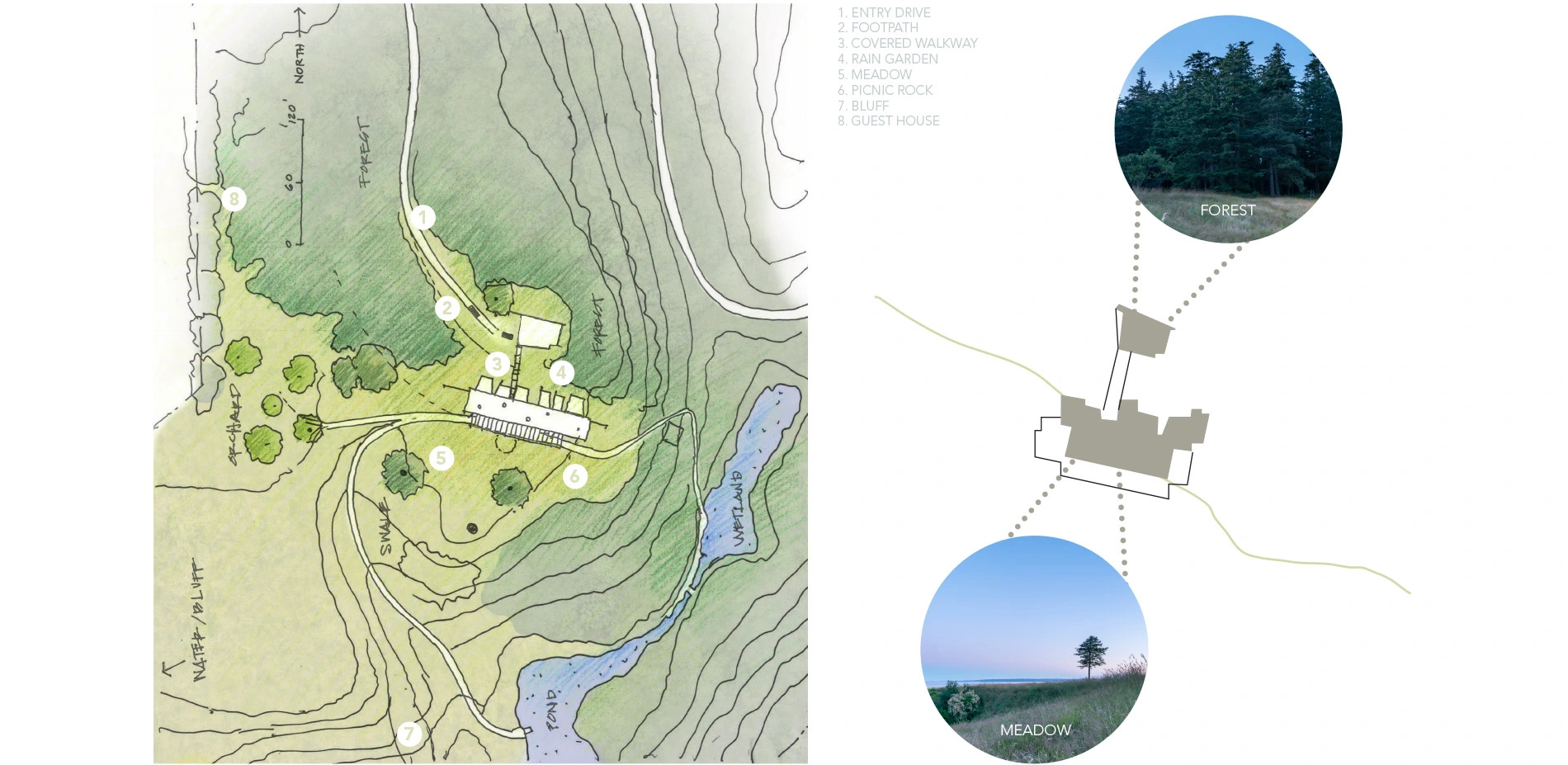 One first experiences the site meandering slowly through the deep forest on a double track dirt and gravel road. The arrival drive rolls and bends around huge second-growth firs with little evidence of human intervention. After what seems an eternity, a hairpin turn rises up a small hill, and as you crest the top, the views through the forest start to open up and a bluff is visible in the distance—the arrival experience of surprise and subtlety sets the tone for the overall design.