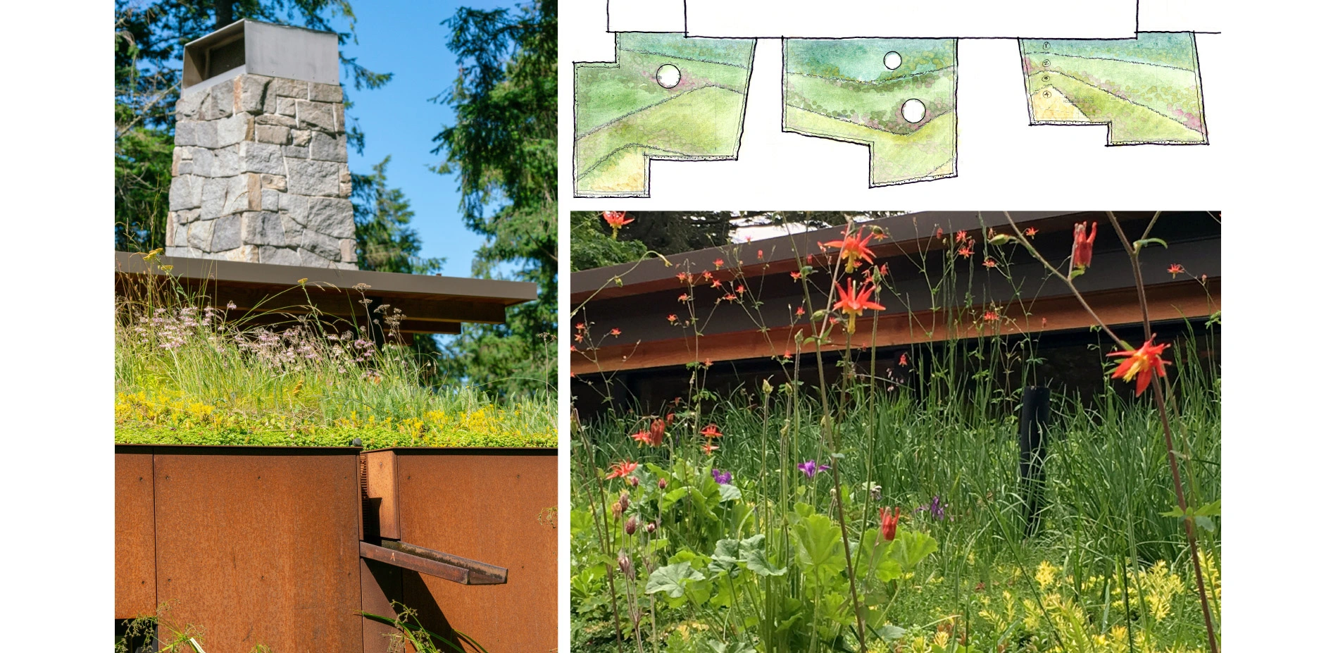 A bright green vegetated roof covers the forested side of the home, and scuppers direct rainwater into the absorbent landscape of the rain garden below. The roof combines red columbine, phlox, yarrow, and alpine anemone, grounding the architecture and adding to the immersive experience desired by the owners.