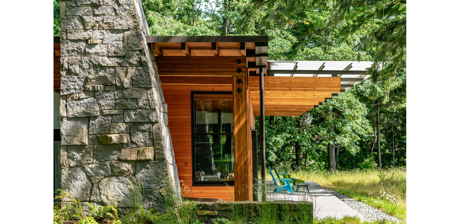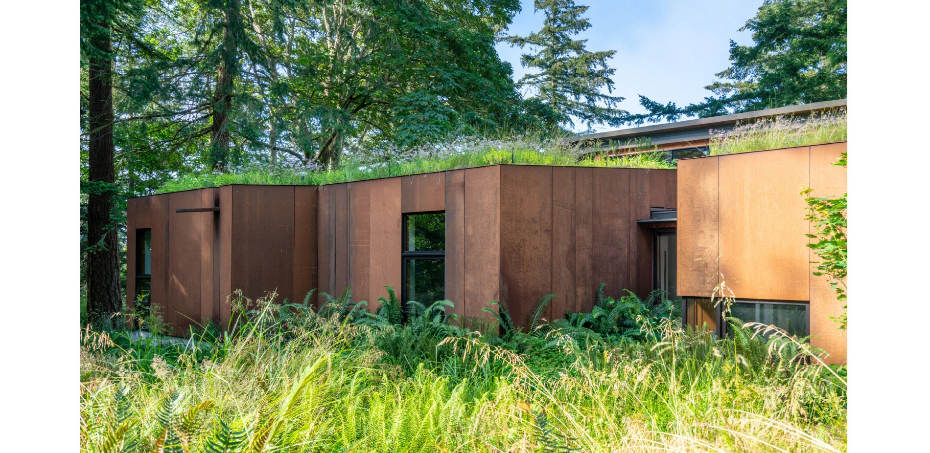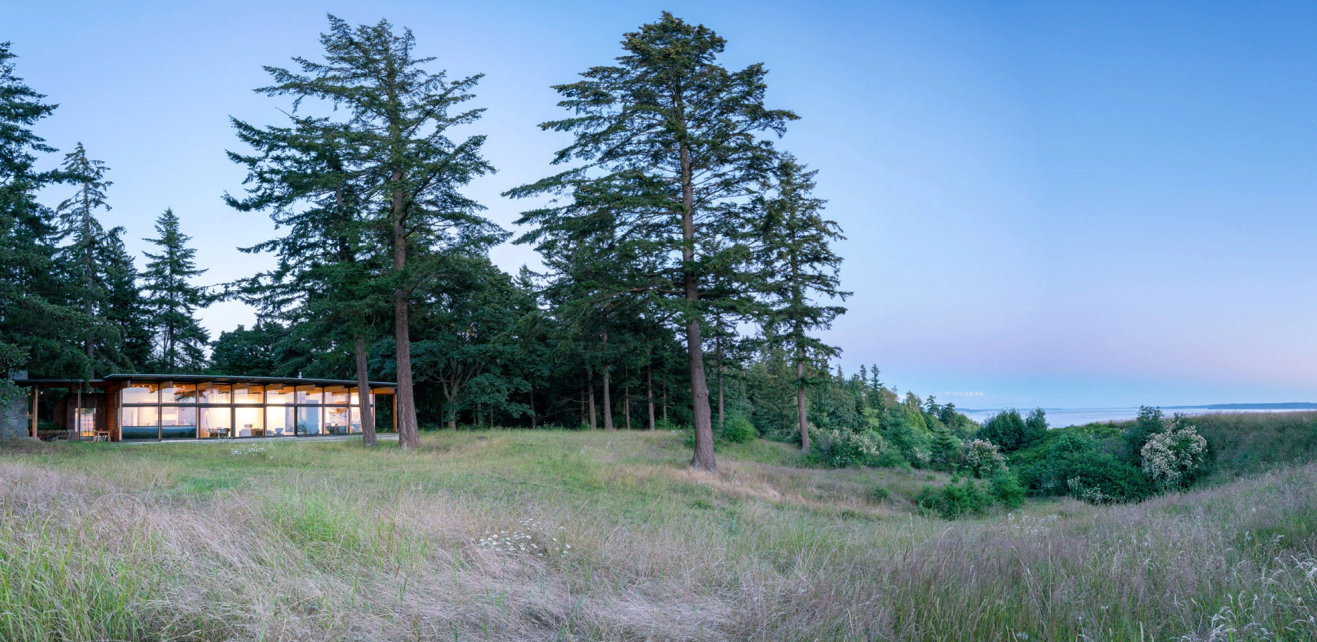 The clients, a wildlife photographer and a blacksmith, relocated to this wooded 80-acre waterfront site on the southwest corner of Whidbey Island, a 20-minute ferry ride north of Seattle. They placed the majority of the site in a permanent conservation easement and retained an acre to build a 2,000-square-foot main house, guest cabin and workshop. They situated their home in a location that is not readily visible from the water, with the philosophy that that if they wanted to experience the water’s edge, they could walk out there rather than mar the view of this undeveloped piece of the island for others. As a result, the home sits several hundred yards from the edge of the bluff at the interface between forest and meadow. Subtle grading and vegetated roofs create the impression of being immersed in the landscape on the forest side, while open and expansive on the water side. The result is a thoughtful and beautifully crafted home that feels as if it grew out of the site.