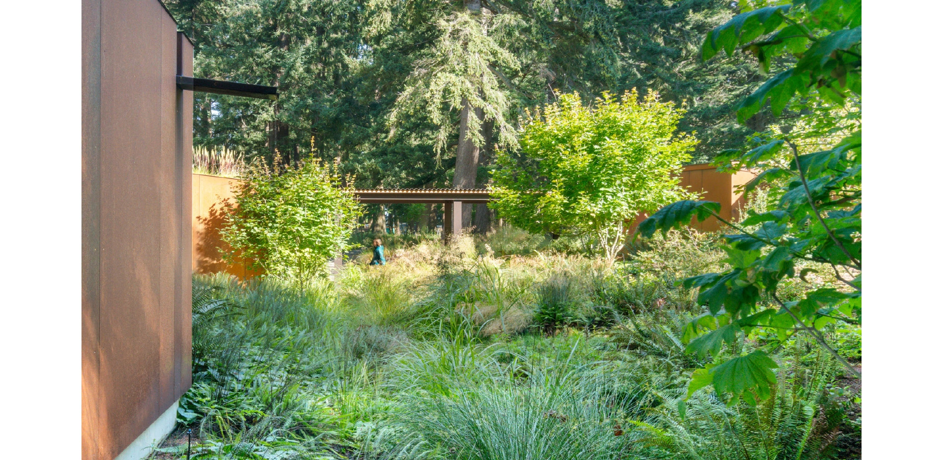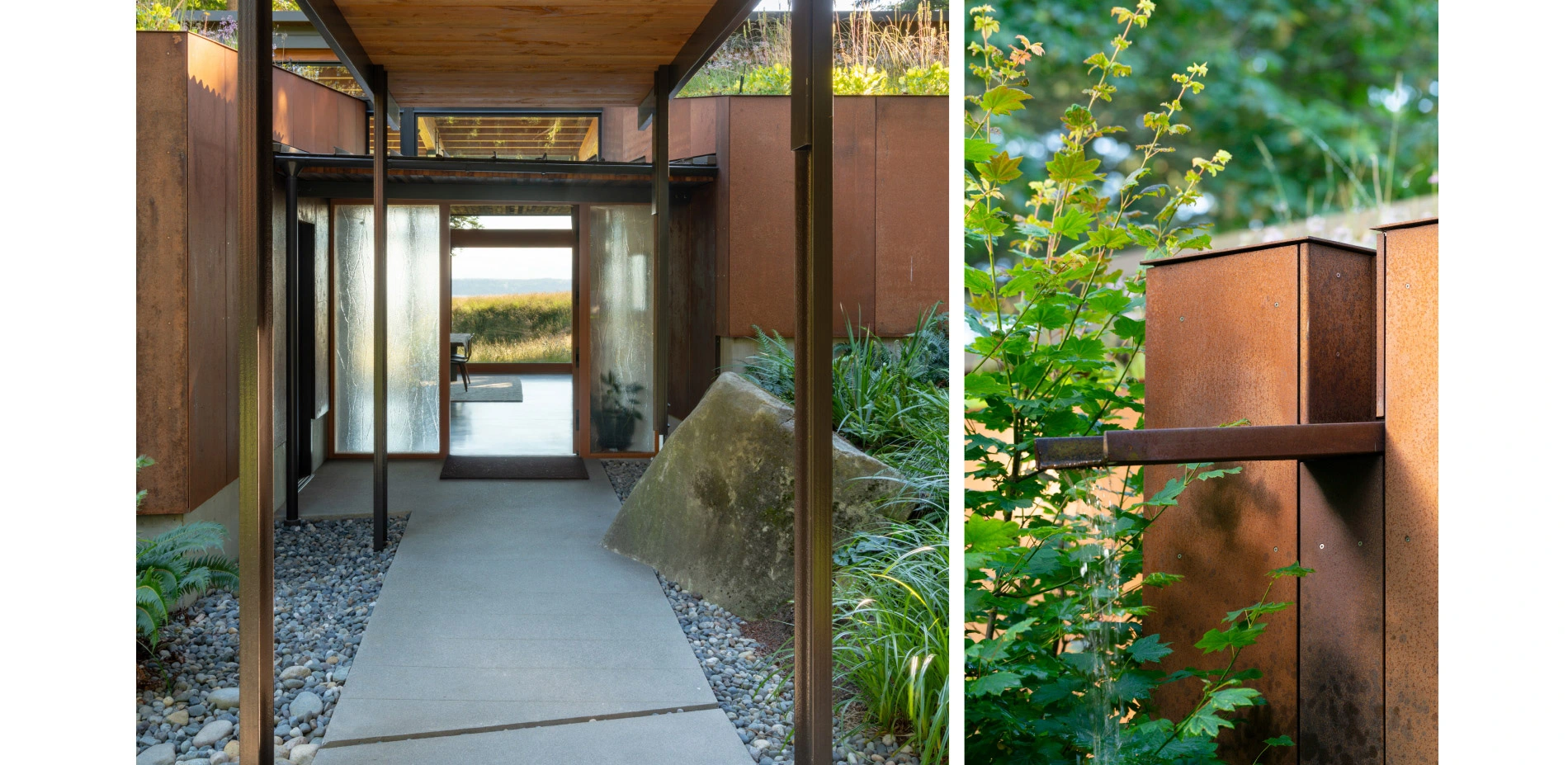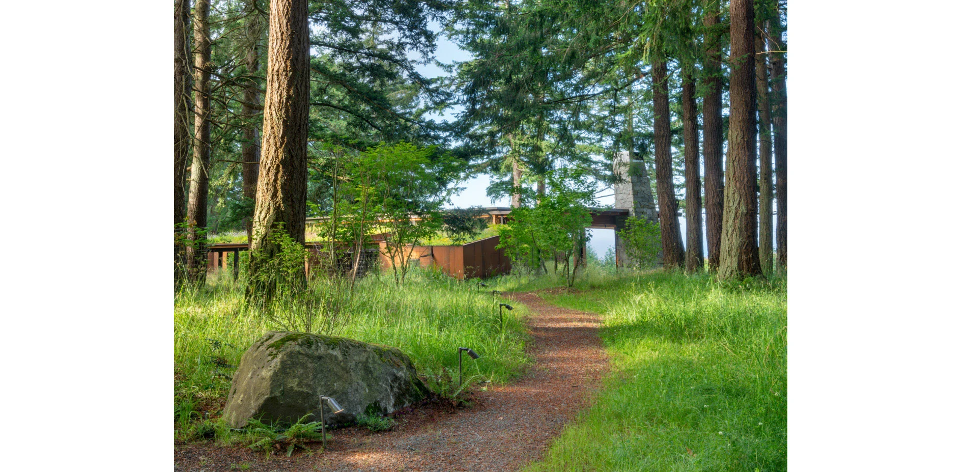 Beneath the covered walkway, a single post lands delicately on a huge boulder, retaining grade just to the right of the front door, as if the home were built around it. A slim gap in the walkway allows water to flow from one side of the rain gardens to the other. The water-like textured glass front door opens to reveal the interior of a light-filled wood and glass pavilion with floor-to-ceiling windows that provide a surprising and expansive view across a bright grassy meadow and Puget Sound beyond. The striking contrast of the dense forest and the soft meadow environments is the intentional result of a careful and collaborative exploration of siting by the owners, architect and landscape architect.