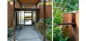 The gravel drive continues to a small turf parking area that allows for a slight glimpse of a structure through the open forest. From there, a gently curving and lightly lit footpath begs visitors to follow it toward the house. The path descends into the lush landscape, creating a sense of calm and decompression as guests walk to a slender, covered walkway that connects the main house and the garage. Here, the partially buried, metal-clad exterior of the main house begins to emerge.