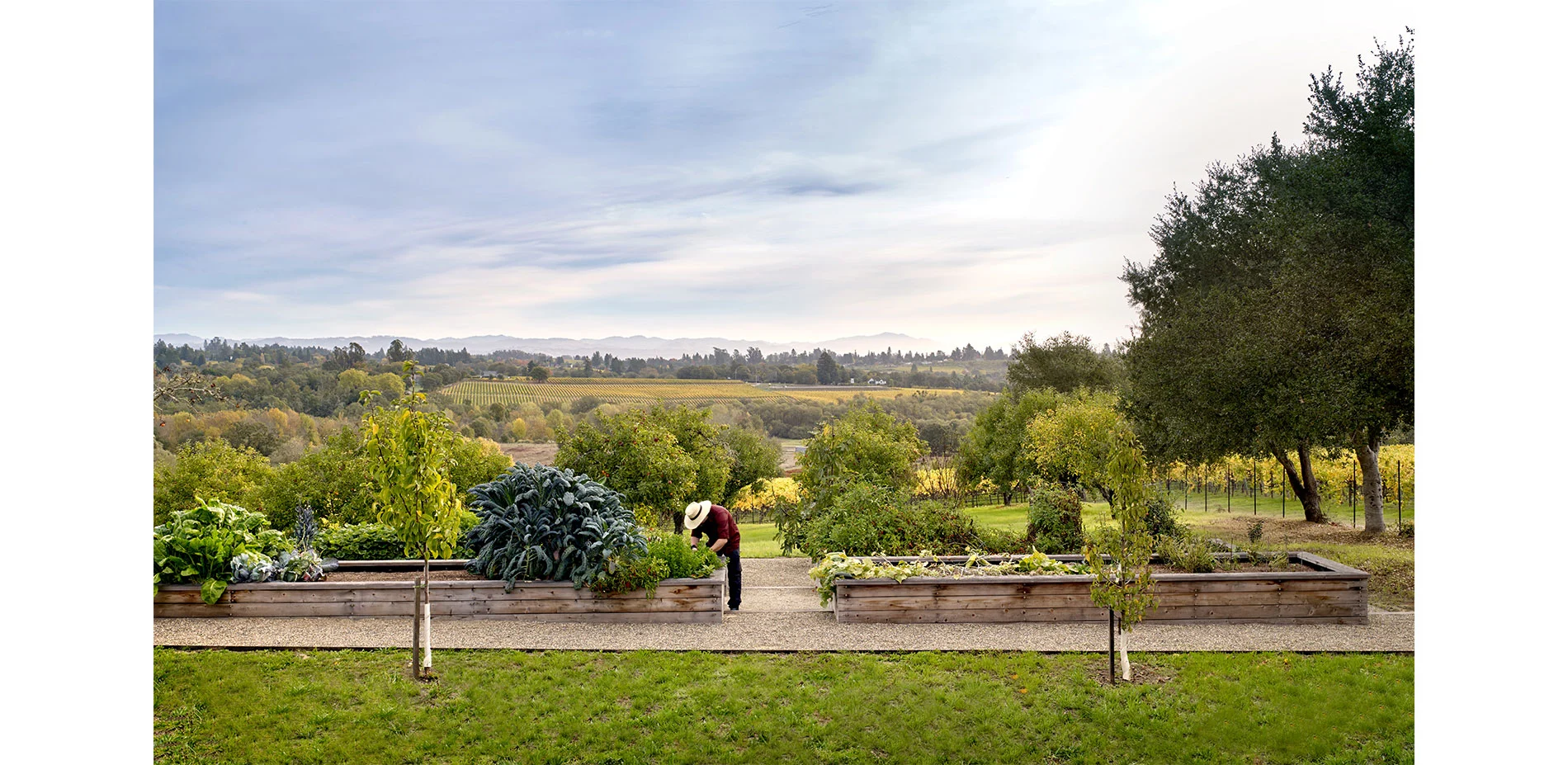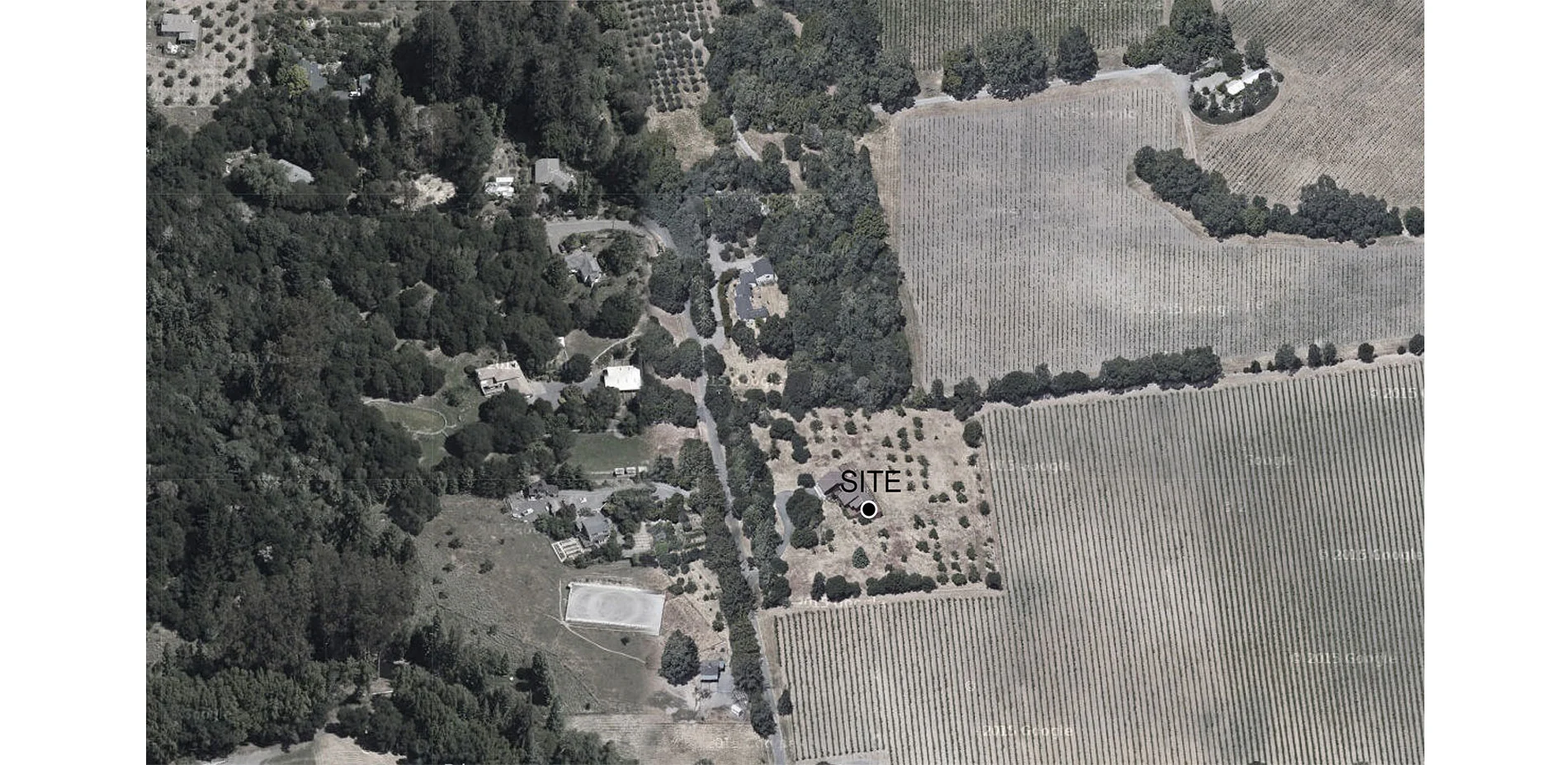 The three-acre site is at the intersection of coastal oak woodlands and cultivated fields of vineyards and Gravenstein apple orchards. The Gravenstein was the most widely grown crop in the small farming community of Sebastopol in Northern California during the early 20th century when much of the harvest was used for apple sauce and dried apples shipped to troops during WWII. Due to disease and lower yields, only a few orchards remain that have not been replaced by the more profitable grape growing. The house and an existing neglected Gravenstein apple orchard share the property with coastal live oaks that have gradually reclaimed the hedgerows and sections of the orchard that died. Where the apple trees have succumbed to the oaks, the design allows the oaks to reclaim their natural habitat. In areas where the fruit trees are still healthy, the agricultural history of apple cultivation is preserved by restoring portions of the orchard with new trees.