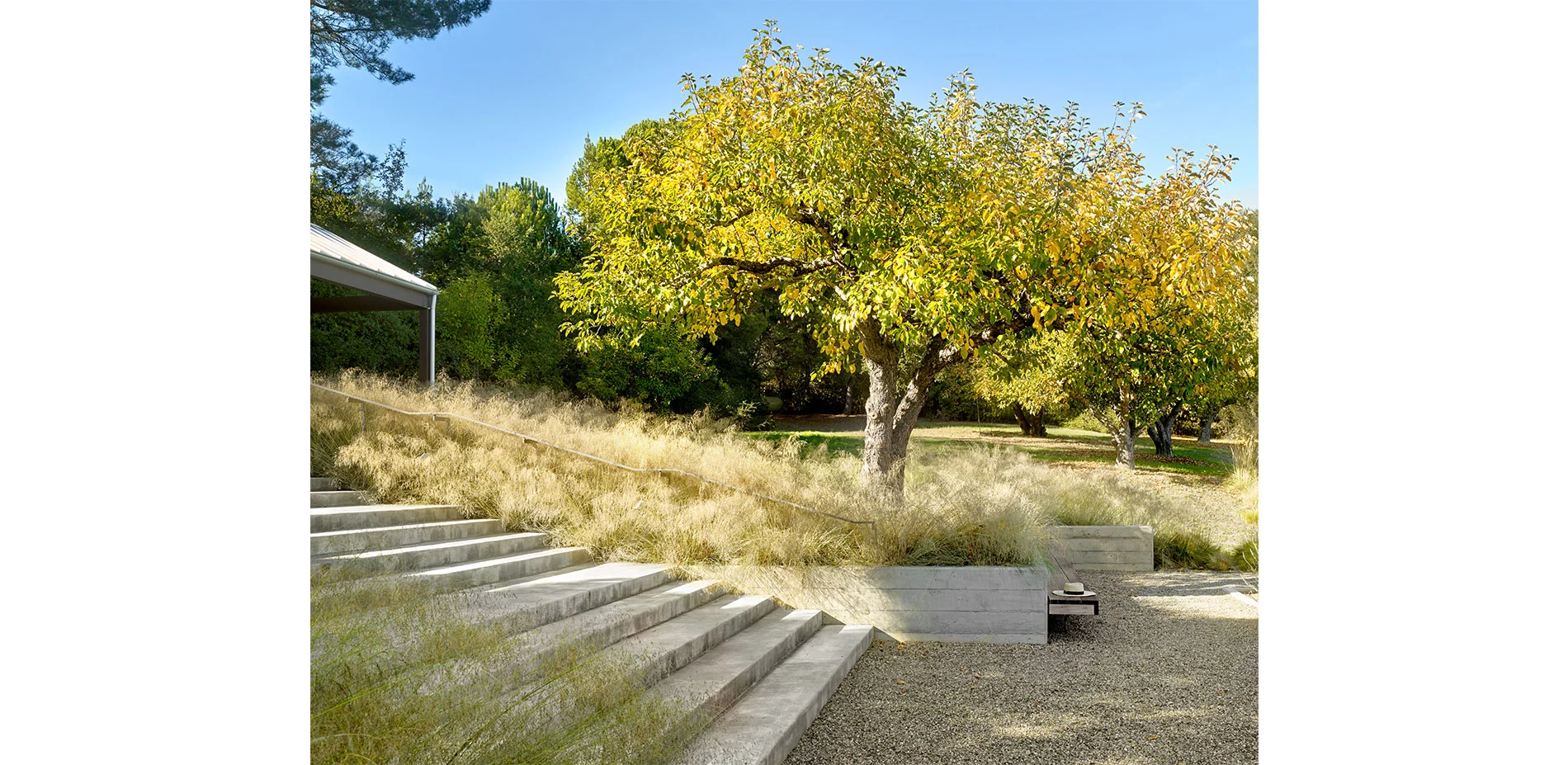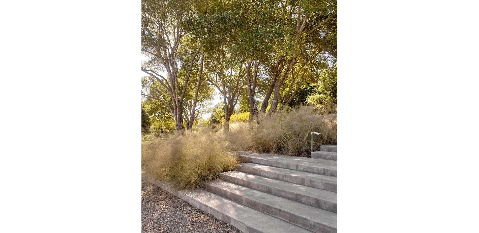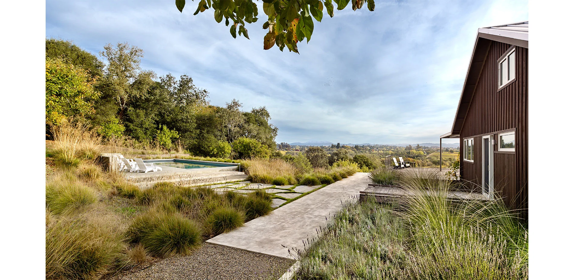 The open landscape and spectacular views dictate a design that intervenes with subtlety. The introduction of simple forms and the use of vernacular materials are used as means to appreciate the natural beauty and history of the site. Upon entering the property, the concrete steps, board formed concrete, gravel courtyards, and a wood bench recall the utilitarian materials that are typical in the farming community. The orthogonal concrete platforms focus the attention on the vineyards in the distance while highlighting the delicate textures and patterns of lights and shadows of the native grasses. The “arms” that extend from either side of the house to the pool decking and gravel walk to the vegetable gardens define the region where the farmed and gridded patterns of the vineyards and orchard meet the less controlled landscape consisting of live oaks and California fescue. A wood bridge spans a stretch of deer grass before entering the house at the front and side yards. The concrete walk engages the distant landscape and connects the entry courtyard to the rear deck and terminates with wood steps to the orchard below.