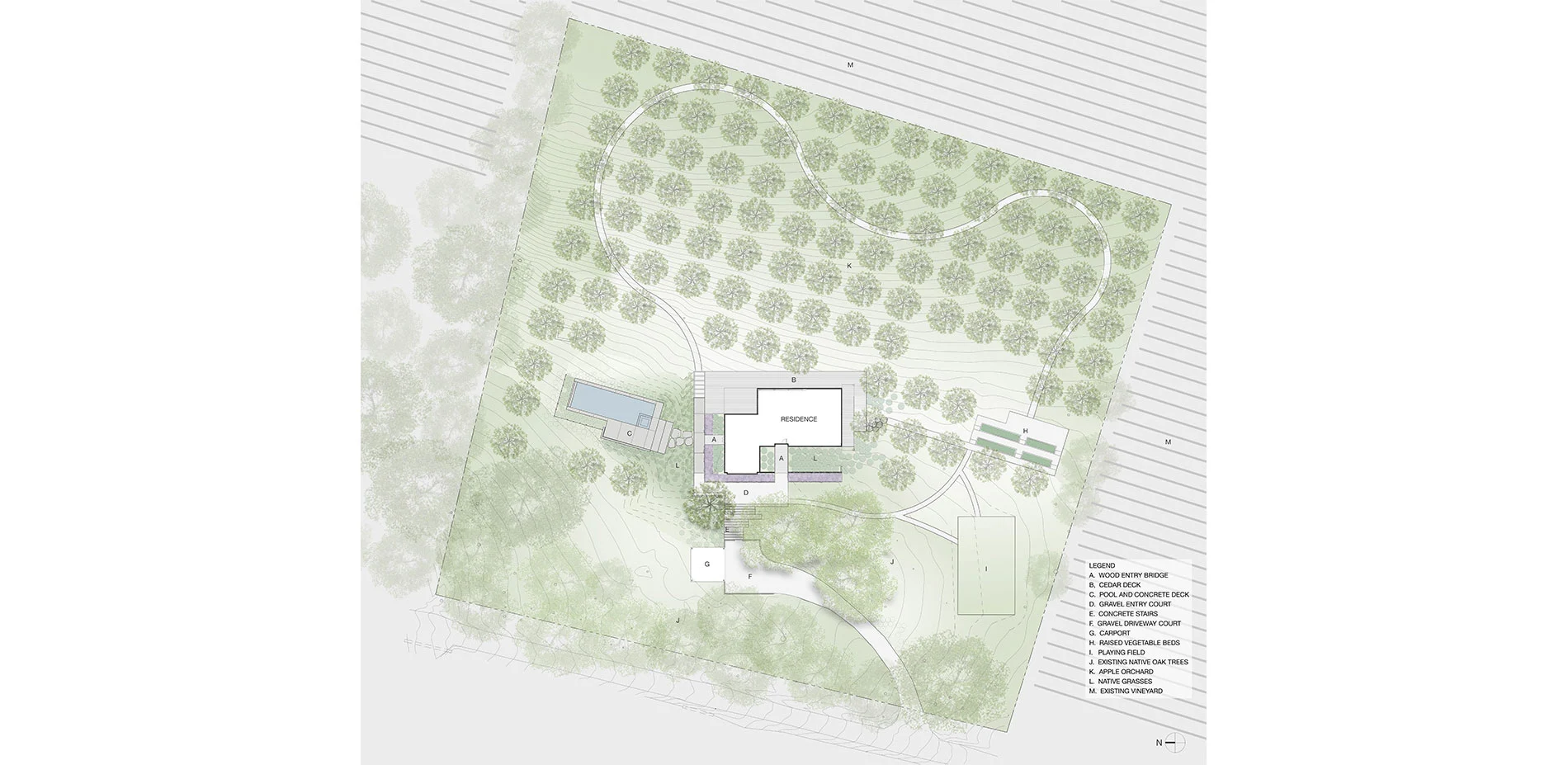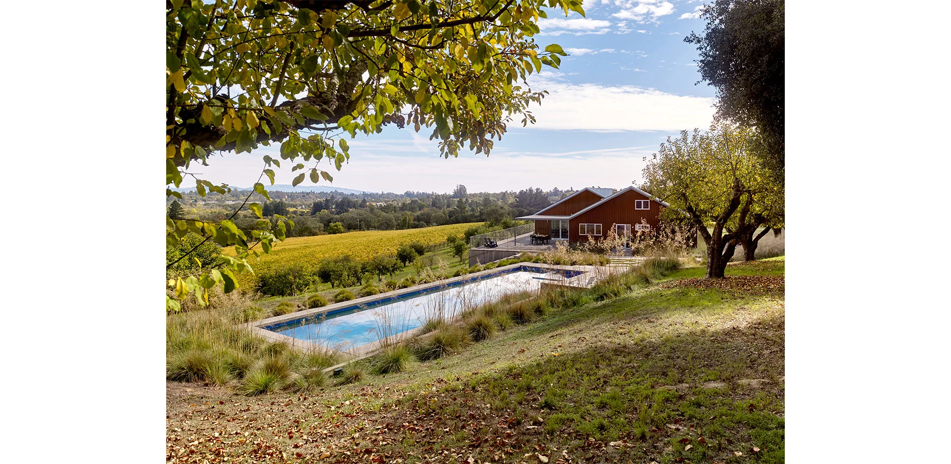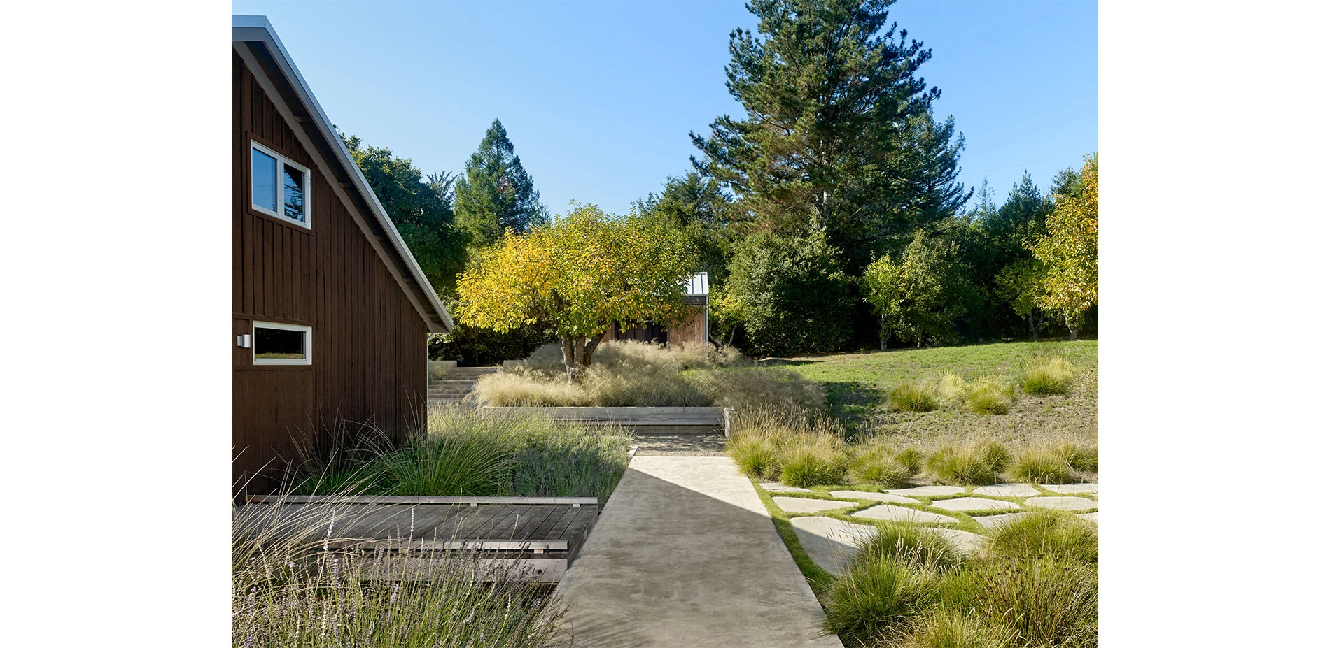 The open landscape and spectacular views dictate a design that intervenes with subtlety. The introduction of simple forms and the use of vernacular materials are used as means to appreciate the natural beauty and history of the site. Upon entering the property, the concrete steps, board formed concrete, gravel courtyards, and a wood bench recall the utilitarian materials that are typical in the farming community. The orthogonal concrete platforms focus the attention on the vineyards in the distance while highlighting the delicate textures and patterns of lights and shadows of the native grasses. The “arms” that extend from either side of the house to the pool decking and gravel walk to the vegetable gardens define the region where the farmed and gridded patterns of the vineyards and orchard meet the less controlled landscape consisting of live oaks and California fescue. A wood bridge spans a stretch of deer grass before entering the house at the front and side yards. The concrete walk engages the distant landscape and connects the entry courtyard to the rear deck and terminates with wood steps to the orchard below.