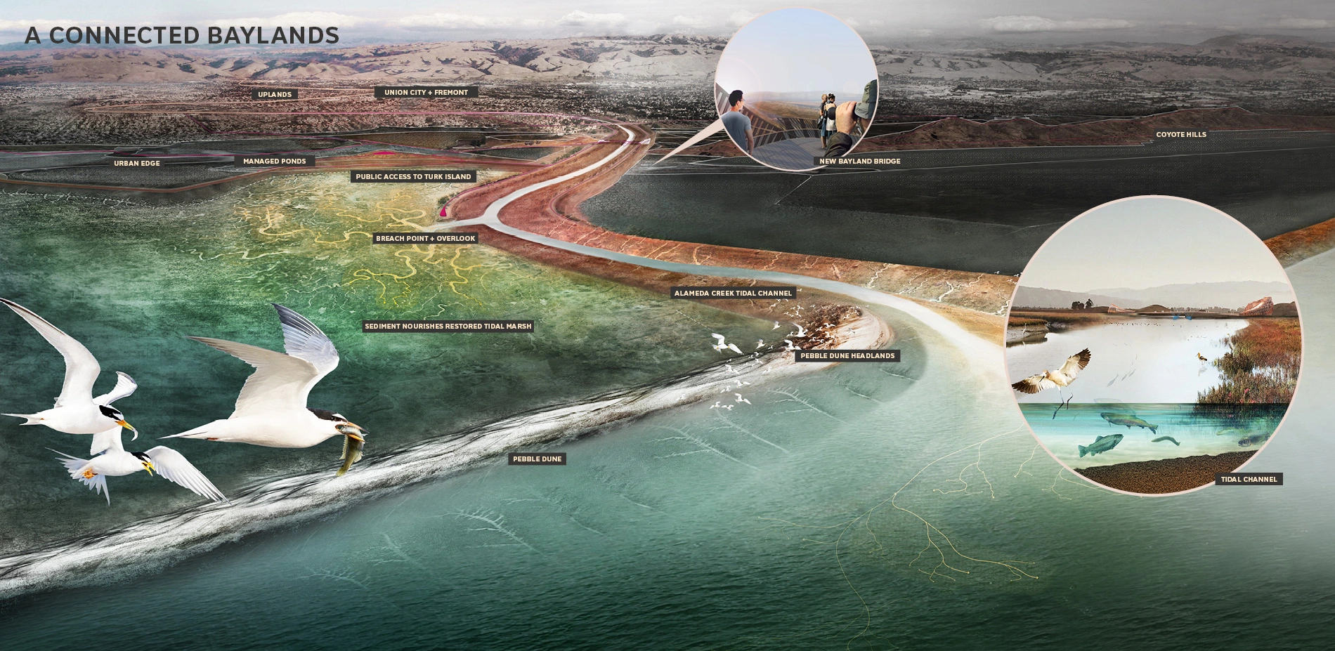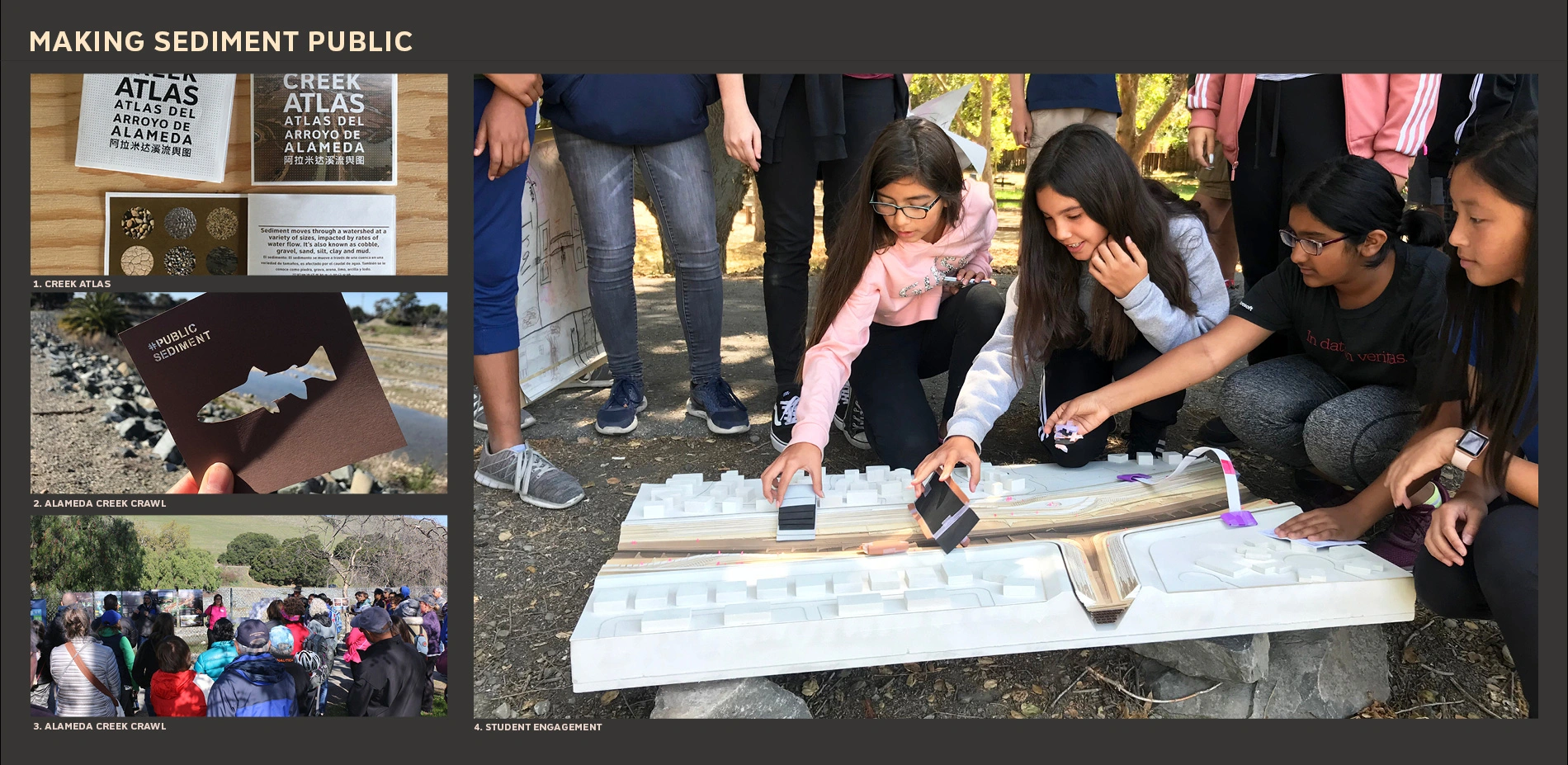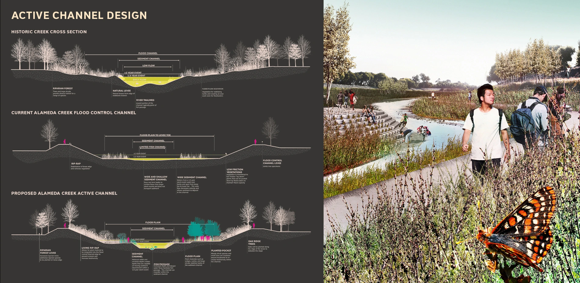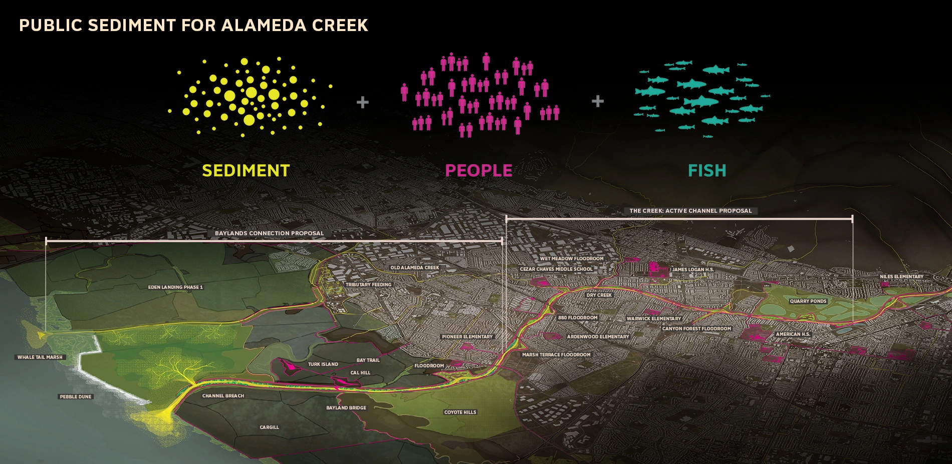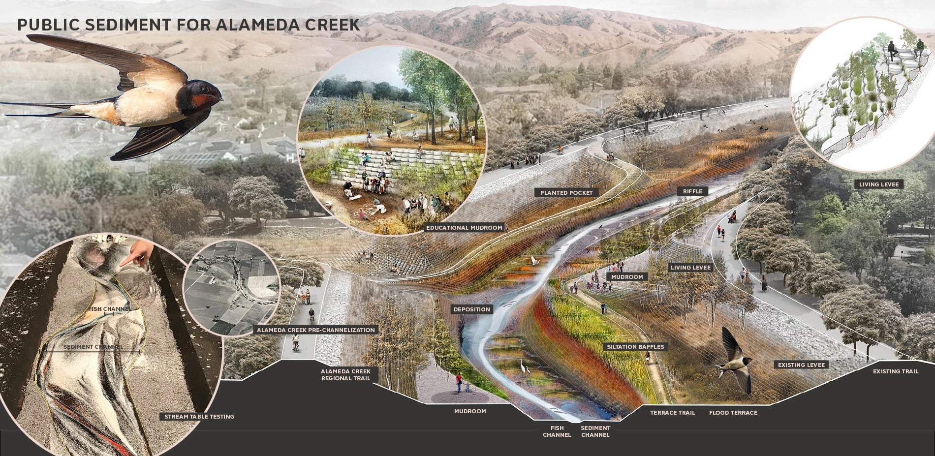 The Bay Area's tidal ecosystems—its marshes and mudflats—are at risk of subsidence and drowning with low sediment supply and sea level rise. Public Sediment for Alameda Creek proposes that sea level rise adaptation must extend upstream, redesigning sediment flows to sustain tidal ecosystems and protect vulnerable communities. Public Sediment for Alameda Creek is a plan to reconnect the creek with the bay, provide a sustainable supply of sediment to baylands for sea level rise adaptation, reconnect migratory fish with their historic spawning grounds, and introduce a network of community spaces that reclaim the creek as a place for people. The proposal represents a paradigm shift in how we plan for climate change. Rather than hardening the edge, we must recalibrate our relationship with sediment and water resources and invest today in living systems that will grow over time to adapt to sea level rise. The project was created with extensive input from community stakeholders for the Resilient by Design initiative and has since continued with pilot funding from the National Coastal Resilience Fund.