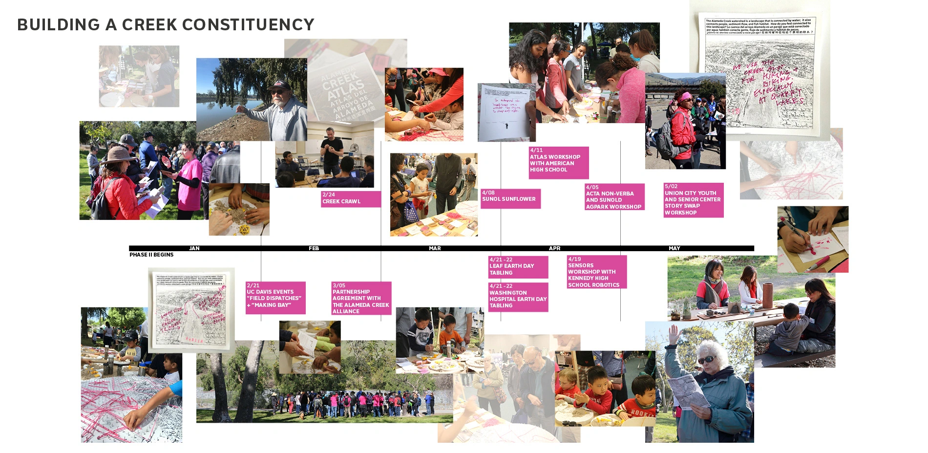 The transformation of Alameda Creek from creek to flood control channel has erased its public identity as a landscape resource. The project team has been holding events in and around the Creek to understand how people perceive this space today, how they remember it, and how they want to use it. The Creek Atlas synthesizes these narratives and reflects on changing attitudes towards Alameda Creek, suggesting new futures for the ecosystem while engaging students, youth, and residents in this dynamic environment. The Alameda Creek Crawl invited over 100 residents and community stakeholders to look past the flood control channel and experience the living creek hidden in their backyards. With these efforts, the team aims to build a stronger constituency for the creek and develop awareness and activism around resources for the future.