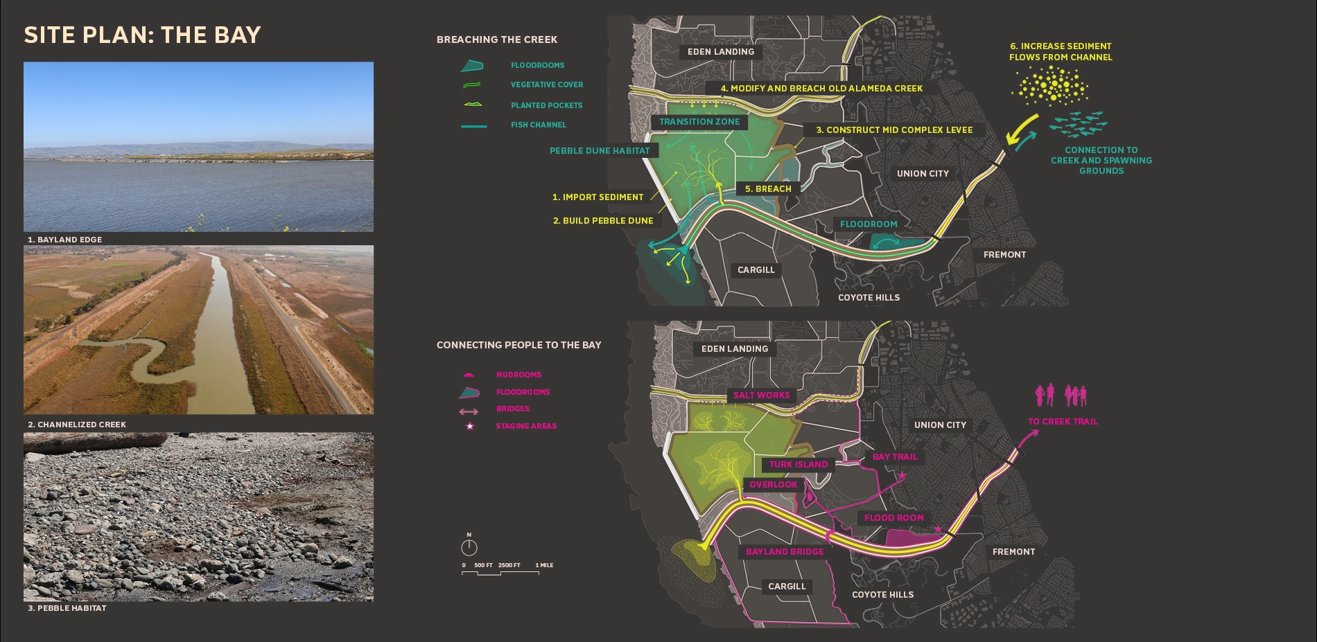 This proposal for the San Francisco Bay Area recognizes the importance of allowing sediment to flow from streams into the marshes and mudflats of tidal ecosystems as a means of maintaining healthy communities and to combat rising sea levels caused by climate change. Created with significant community input, this paradigm-shifting plan recommends the redesign of the Alameda Creek to better transport sediment, provide fish habitats, and create opportunities for public spaces along the waterway. It helps puts the issue on the agenda for landscape architects and treats sediment not as waste but as one of the most valuable things we can hold on to as coastal processes are changing.