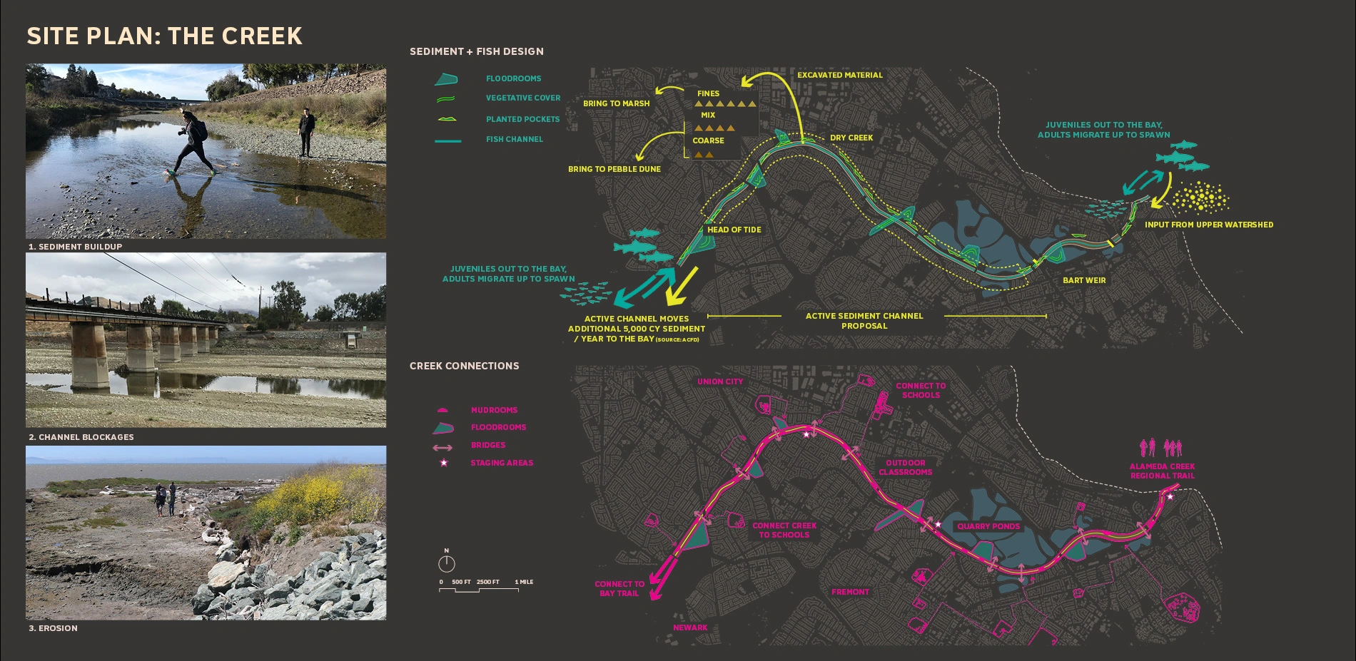 Public Sediment for Alameda Creek is a proposal that addresses the challenge of sediment scarcity along the vulnerable urban edges of Fremont, Union City, and Newark. To bring sediment to the baylands and adapt to sea level rise, our team looks upstream to Alameda Creek, the largest local tributary that feeds the Bay. The proposal aims to redesign this waterbody to create functional systems that sustainably transport sediment for sea level rise adaptation, engage people, and provide habitat for anadromous fish.