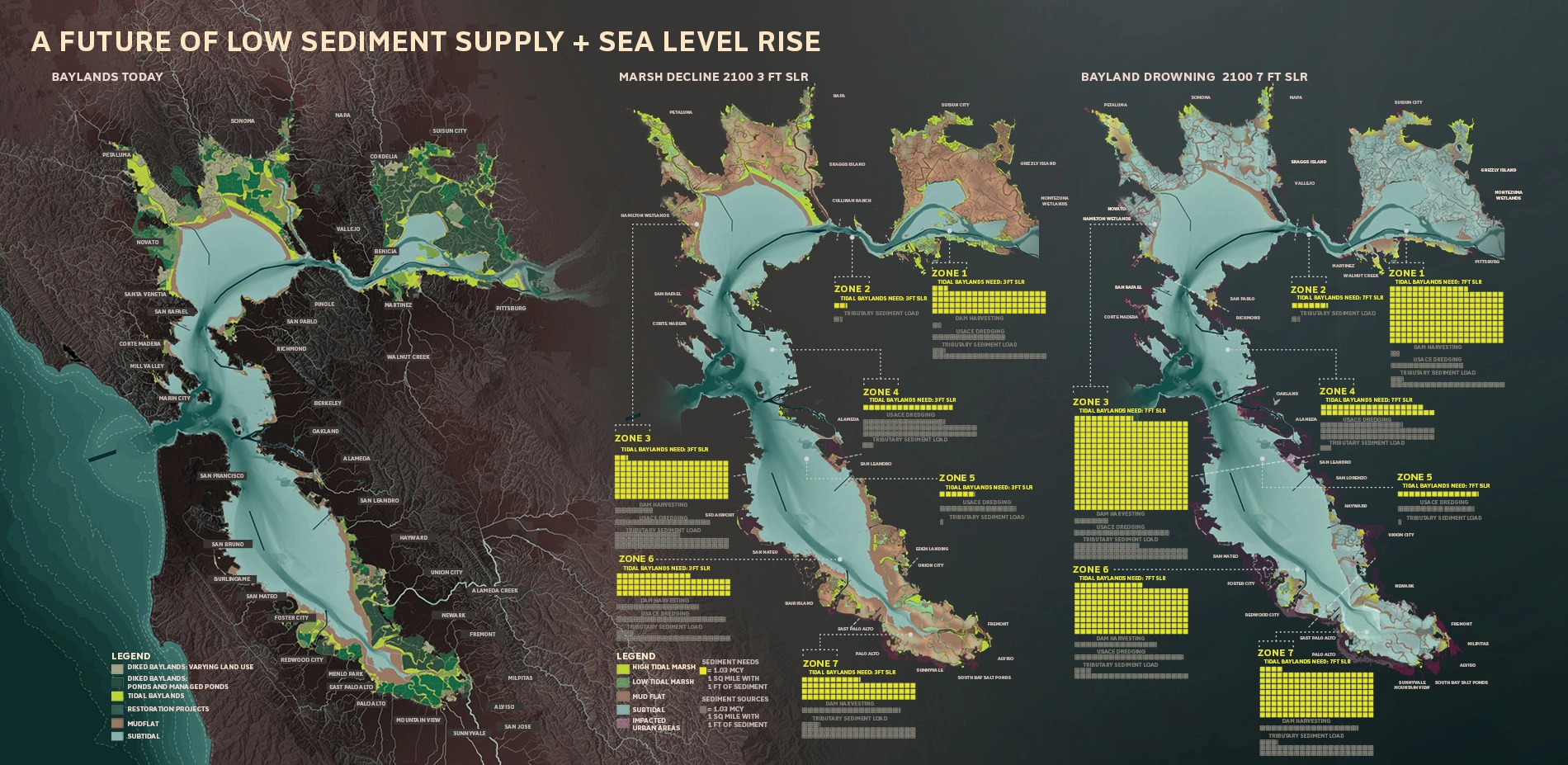 Tidal ecosystems are protective infrastructure that cushion the urban edges of the San Francisco Bay. These systems require sediment to grow vertically in response to sea level rise–without sediment, our baylands will drown. Low sediment supply due to upstream dams and channelization represents a slow but devastating scale of loss that threatens ecosystems, recreational landscapes, and places hundreds of thousands of residents and the region's critical drinking water, energy, and transportation systems at risk.