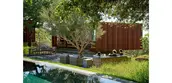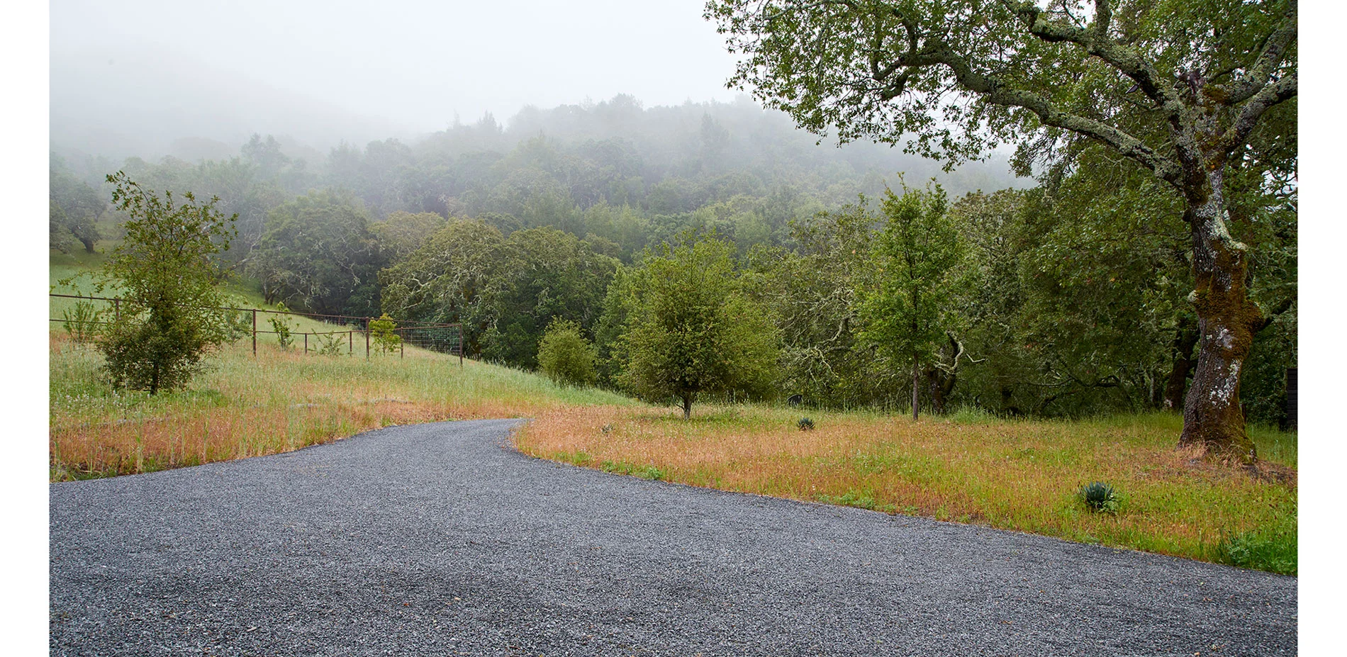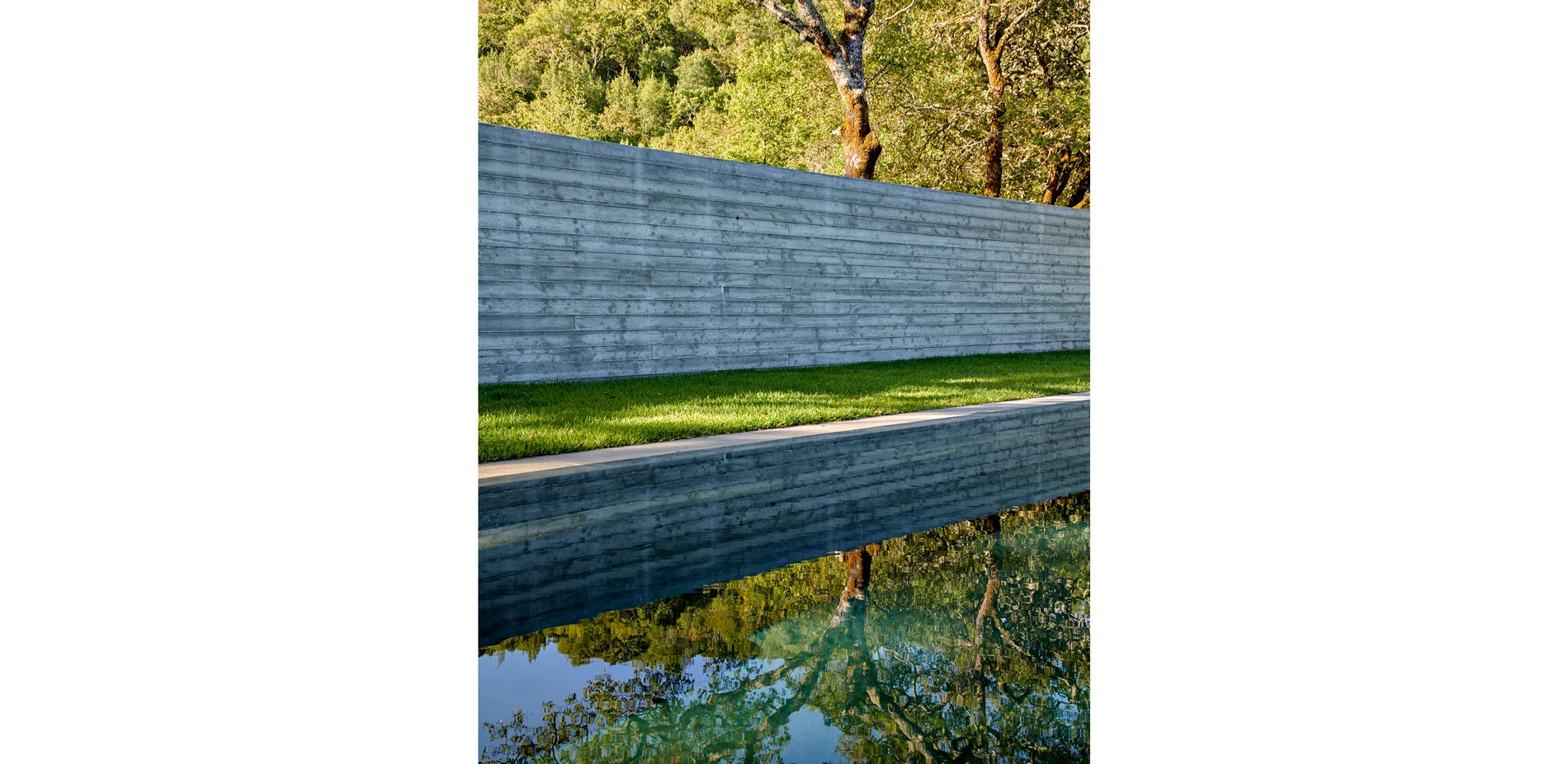 Hardscape materials comprised of natural stone, weathered steel, and board-formed concrete gently impose on the naturally beautiful and ecologically conserved site. The precisely crafted board-formed concrete wall that separates journey from relaxation, vehicle from pedestrian, holds a wide portal to the heart of the project, a courtyard that includes an outdoor kitchen, pool, aggregate-paved seating areas, and a terraced lawn. Each material change in this zone is crisply executed such that soft, hard, textured or liquid surfaces lend maximum contrast to the overall aesthetic of the space, calming the senses with restraint. To relax the orthogonal nature of the space, a lone, aged olive tree resides in the lawn as sculpture on a plinth. Along the edges of the space, oaks and grasses envelope and transition the designed intervention back into nature.