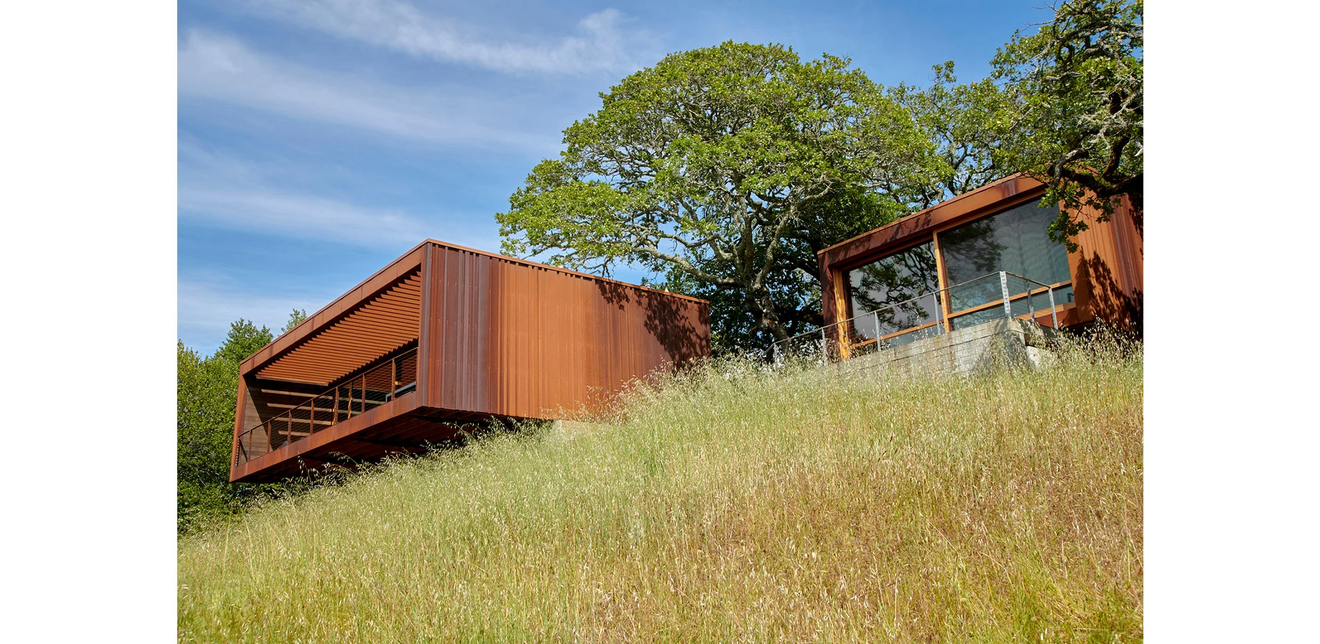 Situated on a 4-acre parcel within a 96-acre preserve on Sonoma Mountain, this hidden retreat offers private spaces for entertainment, recreation, and respite. A masterplan effort optimized the potential of the exterior spaces with adjacency to structures while hiding vehicles from sight, all along a sloping hillside. Elements of the site are organized along the sloping meadows amongst the predominant native Quercus agrifolia. Two small "weeHouse" structures, connective walks and steps, a pool, outdoor grilling area, privacy wall, and seating space are meticulously placed on and carved into the site, surrounded by re-sown native grasses. The dwelling spaces, both indoor and out, offer stunning valley views toward Matanzas Creek below.