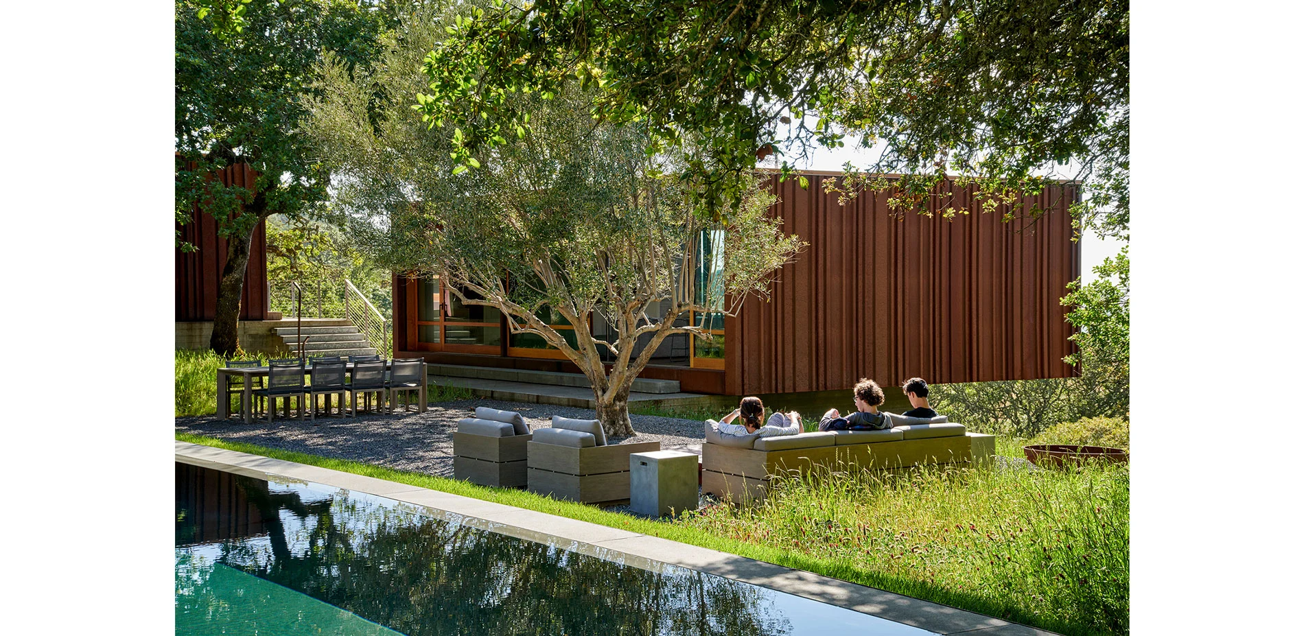 Set on four acres within an open space preserve on Sonoma Mountain in Northern California, the meticulously designed outdoor rooms for this tiny weekend home include a pool, a grilling and dining area, and a family gathering spot, and take full advantage of the spectacular views from the site. A finely crafted board-formed concrete wall separates the parking area from the living spaces, and natural stone and weathered steel help bring clarity and consistency to a design for outdoor living that is at once thoroughly elegant, utterly welcoming, and perfectly at home in its stunning natural setting.