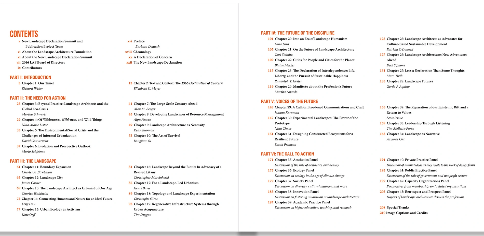 In June 2016, the Landscape Architecture Foundation (LAF) convened over 700 designers from around the world for a Summit on Landscape Architecture and the Future to set the course for the discipline in the 21st century. This historic gathering marked 50 years since Ian McHarg, Grady Clay, and other leading landscape architects composed LAF's seminal 1966 Declaration of Concern, which decried the burgeoning environmental crisis and heralded landscape architecture as critical to finding solutions. Building on this legacy, the summit was devised to culminate in a redrafting of the original 1966 Declaration of Concern and a landmark publication of the ideas presented.