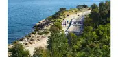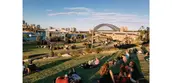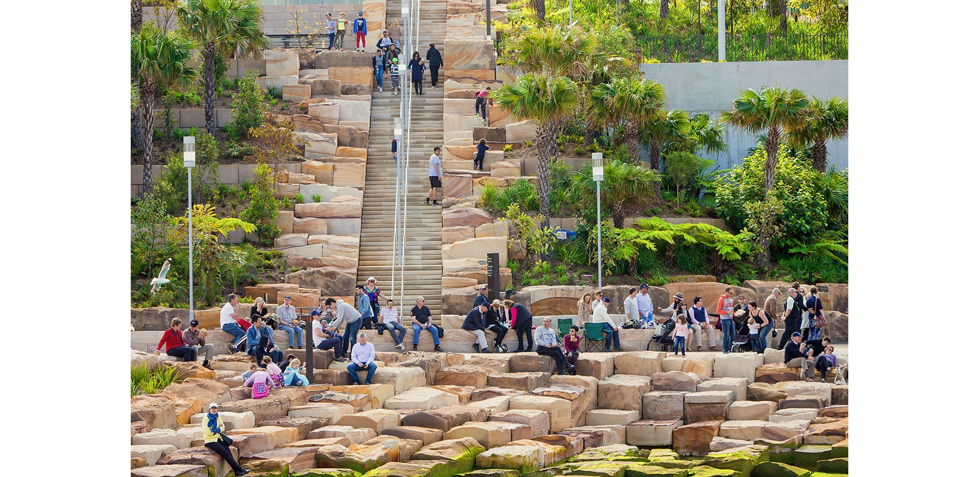 Pedestrian and bicycle pathways wind along the headland, separated by a low, sandstone wall that is a symbolic marker of the original pre-colonial shoreline. The rusticated stone masonry of the "1836 Wall" evokes the first colonial sandstone constructions of Sydney – a material and finish that is ubiquitous throughout the city. An accessible main walkway moves gently up the north slope from Wulugul Walk, terminating at the Stargazer Lawn, the highest point of the headland, which is shaded by large Morton Bay fig trees and eucalyptus. Bush planting discretely conceals the elevator that serves the underground spaces created by the excavation of the sandstone blocks: a 300-car garage and the Cutaway, a large community room—50 by 150 meters—that recalls indigenous cave dwellings and serves as an event space and future cultural center.