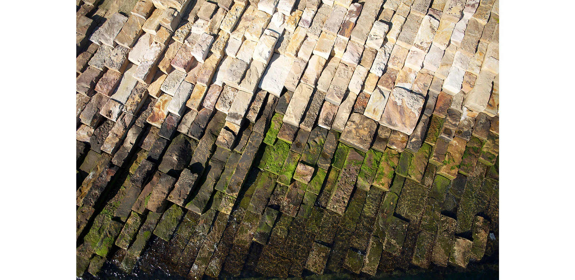 At Barangaroo Reserve a "Club Cape" headland was conceived and realized through close collaboration of specialists working with the lead designers, including a local stone mason, soils scientist, engineer, and horticulturalist, each cherished in his field. The design team was guided by geomorphologic studies as well as historical maps and early depictions including Major Taylor's 1817 panoramic views of Sydney. The chief stone mason was in charge of an on-site quarry operation, creating the foreshore with the artful installation of 10,000 large sandstone blocks—the foundation of Sydney Harbour—excavated from the middle of the site. The complicated design required a customized software modeling program and GPS technology, setting a new global benchmark for naturalistic construction; cut from the ancient rock, each block was barcoded and tracked using a smartphone application. The materials removed from the existing site during the quarry operations and the reshaping of the container port and Nawi Cove were ground up for base-fill layers and creation of the headland. The soils scientist developed a blended soil recipe from the crushed and washed stone waste that maximized the growth of a native bush planting scheme. The plantings are native, not just to Australia but specifically to the Sydney area. Plant material was pre-grown for 2 years on Mangrove Mountain, two hours north of Sydney.