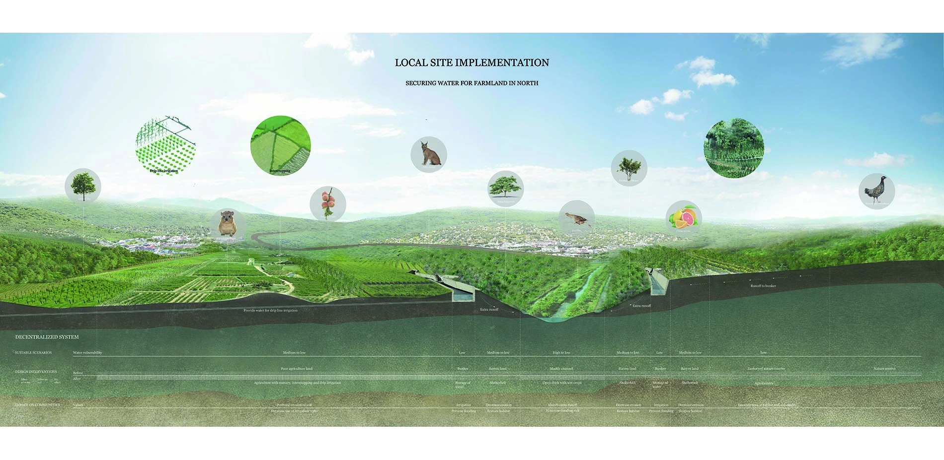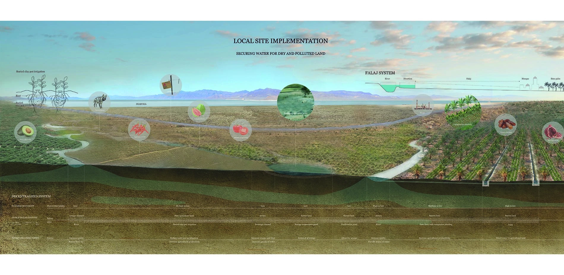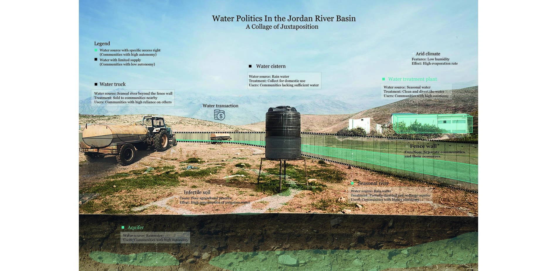 The project proposes a new design framework that enables a new strategic plan for a decentralized system to achieve water security at the community level and conflict resolution at the regional level. It offers a viable alternative to the current centralized water management system and proposes to assert water security as a critical role in achieving political stability. Navigating between the geopolitical system and landscape features within the shared river basin, the project enables community capacity building to attain water security.