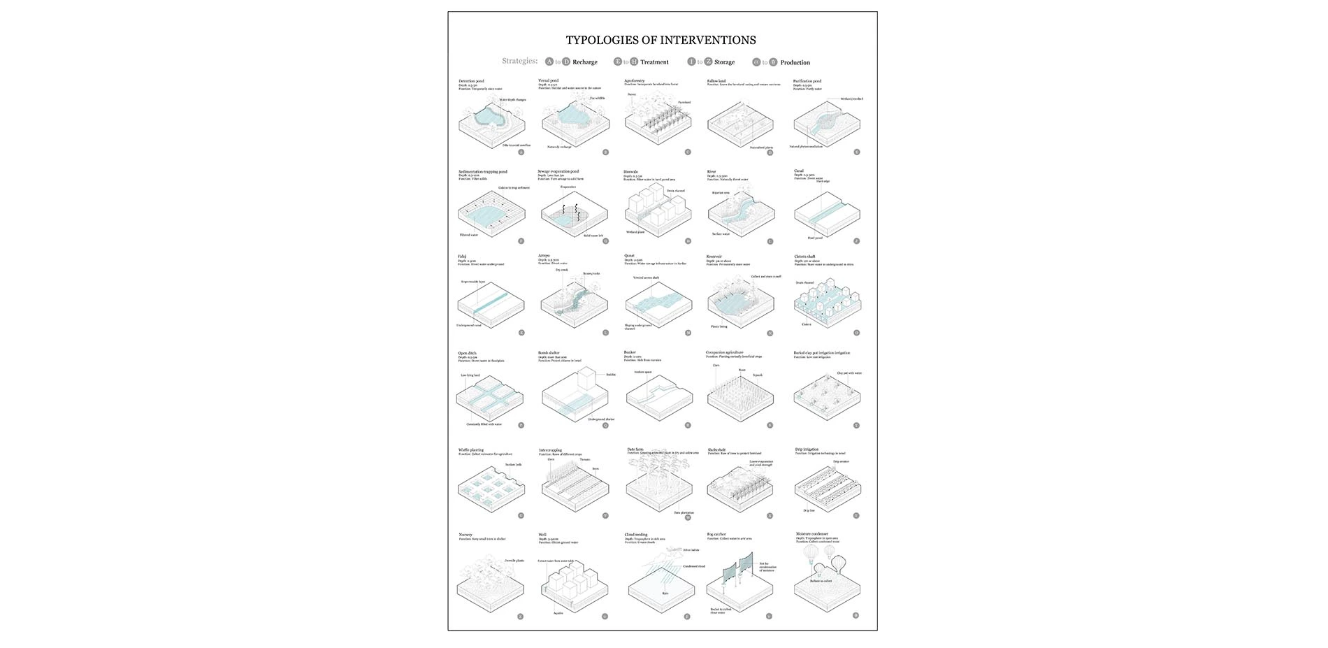 The proposed interventions are based on research of historic infrastructure, climatic factors and modern technology. A design toolkit of strategies (in three languages: Arabic, Hebrew and English) is subsequently created for communities. It is a publicly accessible toolkit of water management at the local level. The design toolkits will be publicly available in the form of pamphlets. Strategies consist of regional planning with bottom-up decentralized interventions to conserve, store, treat, and produce water, and to even recharge watersheds.