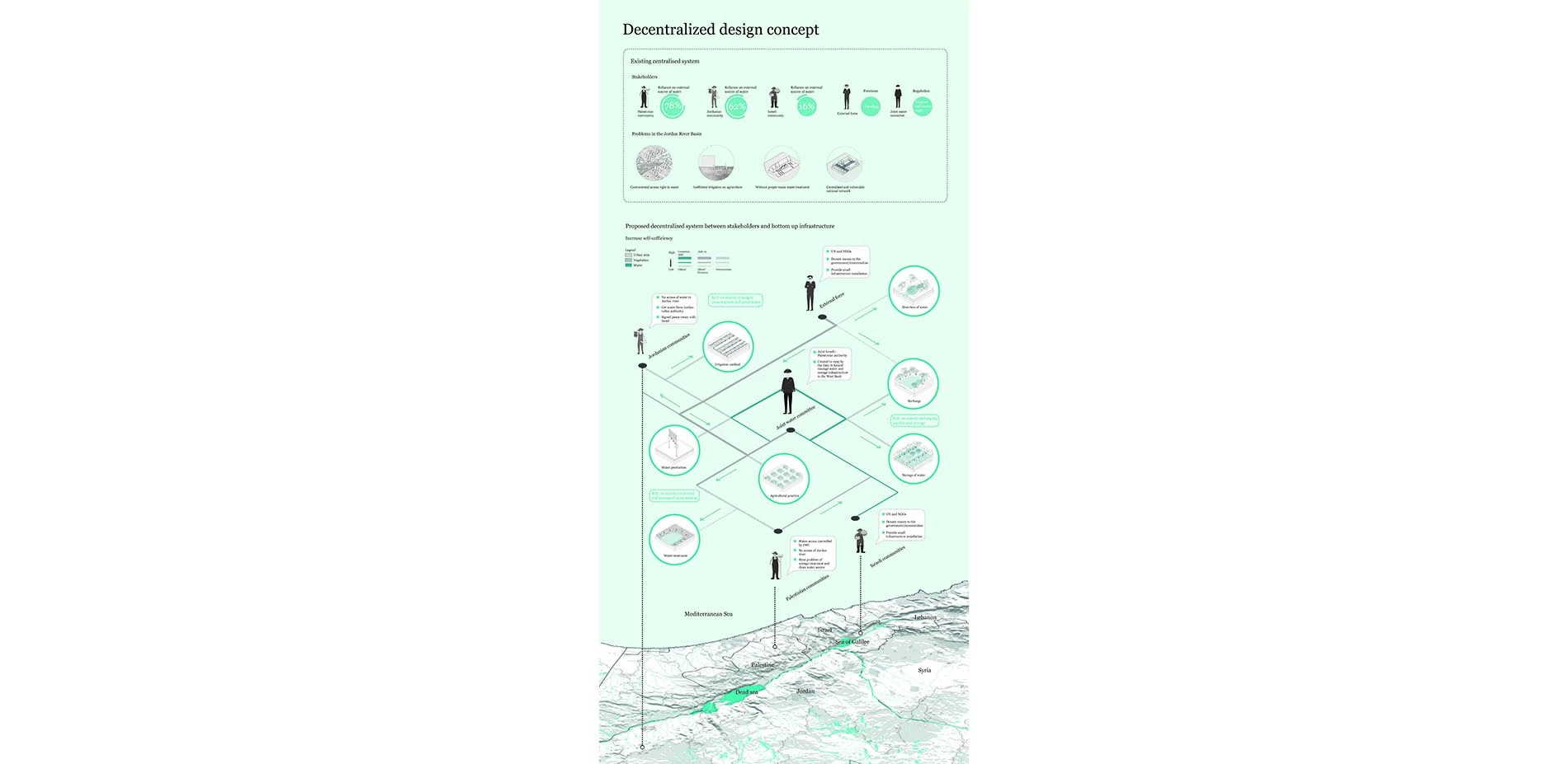 In the six-day war of 1967, water infrastructure was a military target in the Jordan River Basin, resulting in a signing of treaties that outlined a controversial share of water through centralised water networks.To date, water access are still relying on on a centralized national network with water supply in pipes, dams and reservoirs. This over-reliance on the network is a cause of water insecurity and vulnerability for various populations since its distribution is a result of regional political decisions. Water has been abused in conflicts as weapons or targets, threatening safe access to clean water, exercerating water vulnerability in larger population. The project recognises the core issue of water insecurity in the region to be the centralised water system that is susceptible to political disputes in regional level and incapable of addressing water security on local level.