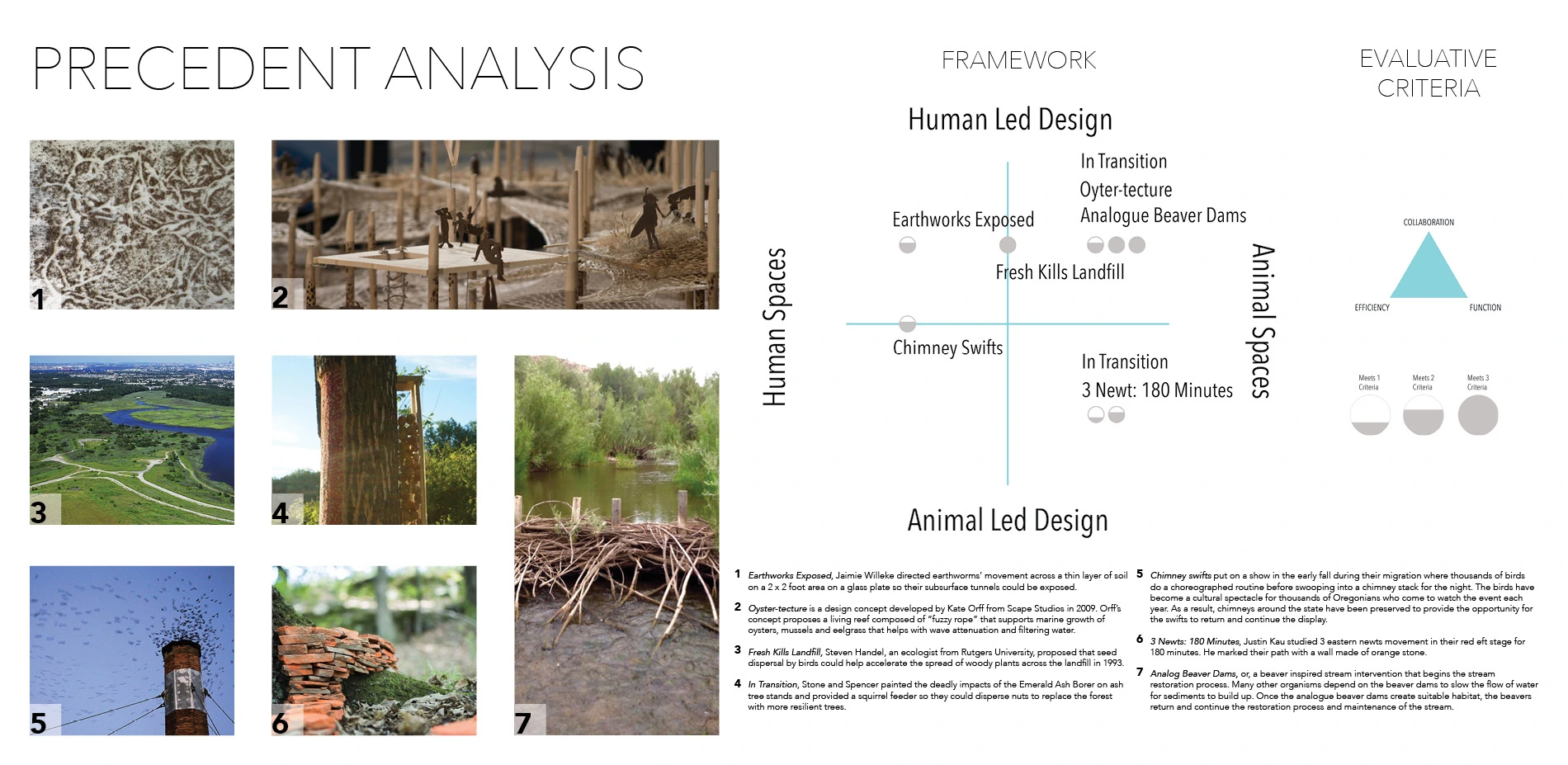 The precedent analysis shows designs that are more successful, meeting all three criteria: collaborative, functional and effective, tend to be human-led in animal spaces. If successful designs are mostly human-led, then designers cannot engage with all animal functions for a specific desired outcome because they do not happen at every site and at any time of year. However, this research has shown that human-led designs with animals that influence the structure and function of the landscape may enhance ecological restoration efforts.