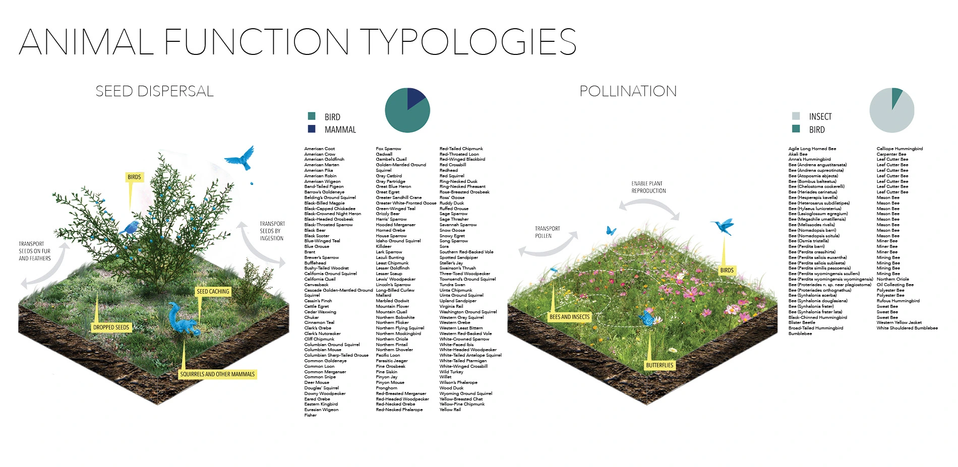 In this research, successful co-creation satisfies a set of criteria derived from definitions of successful ecological restoration (Wortley et al. 2013). The design interventions must be collaborative, functional and efficient. First, the design must be a collaboration between animal and designer. Second, the design must function to achieve the desired ecological restoration. Third, the design must be efficient, i.e., cost effective, low maintenance, time sensitive and self-sufficient in order to compete with human-centered interventions. This research analyzes precedents of co-creation with animals to determine successful approaches to achieve ecological restoration, provides a typology of animal functions with potential for co-creation and provides a framework for how to approach designing with these animal functions. This framework is tested with prototype perches that encourage seed dispersal by birds on a neglected site in Eugene, Oregon.