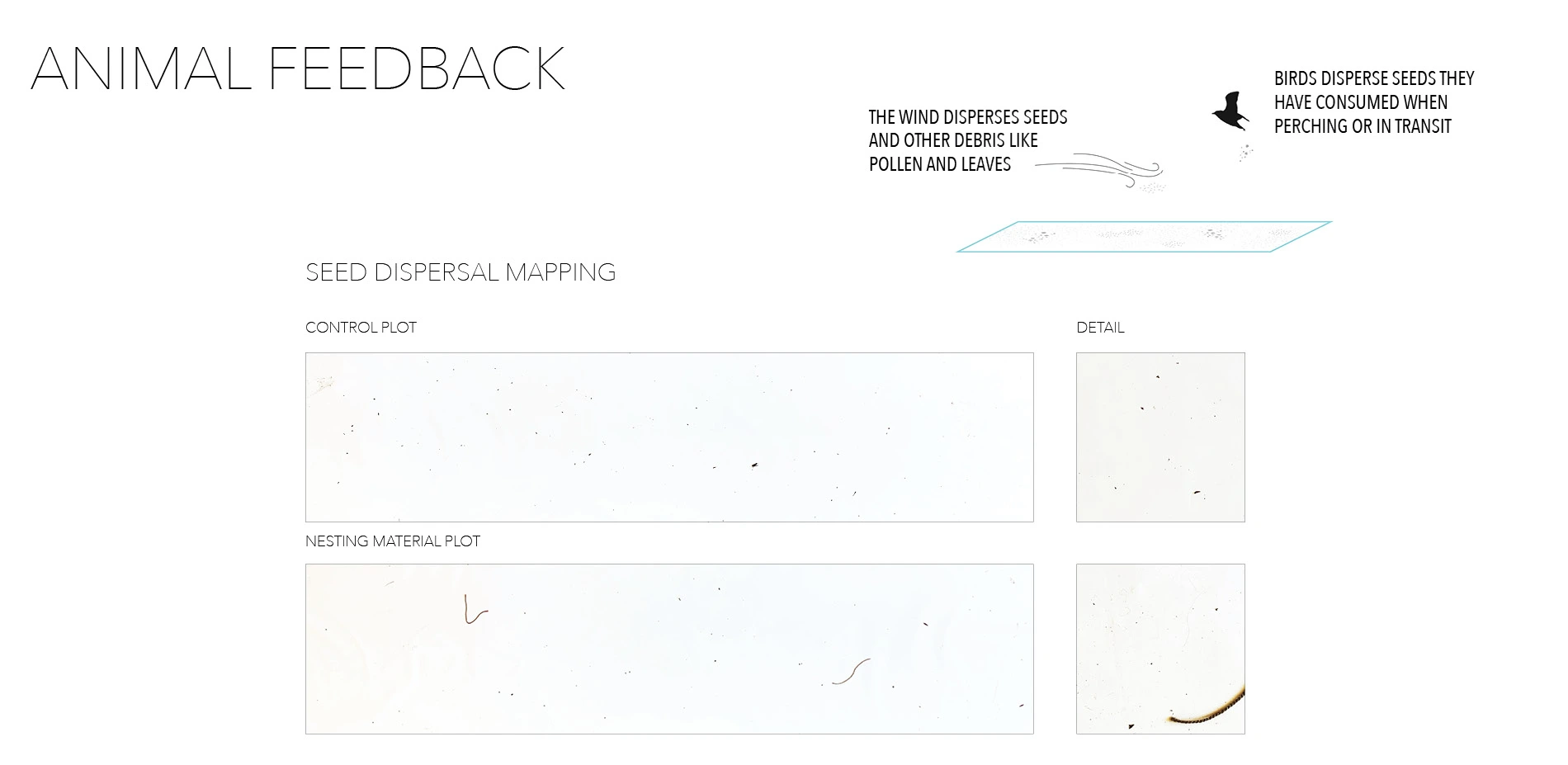 This test determined an efficient and collaborative direction. In order to establish a functional design, the timing of the intervention must coincide with the desired seeding or fruiting plants and with the birds that disperse them. These prototypes will inform an intentional design intervention at the landscape scale, or, the landscape with equivalent ecological conditions. The number, size and location will influence the animal function patterns. This research also showed potential to test prototypes for specific bird species to disperse specific plants. The design at the landscape scale will continue to be directed and maintained by animal and site response.