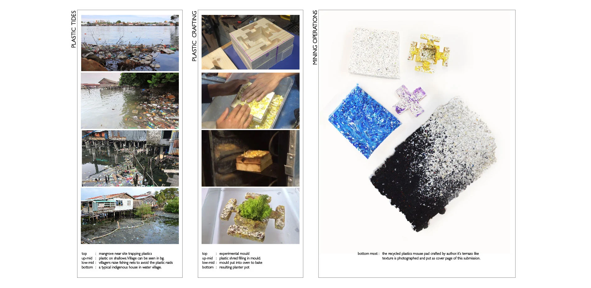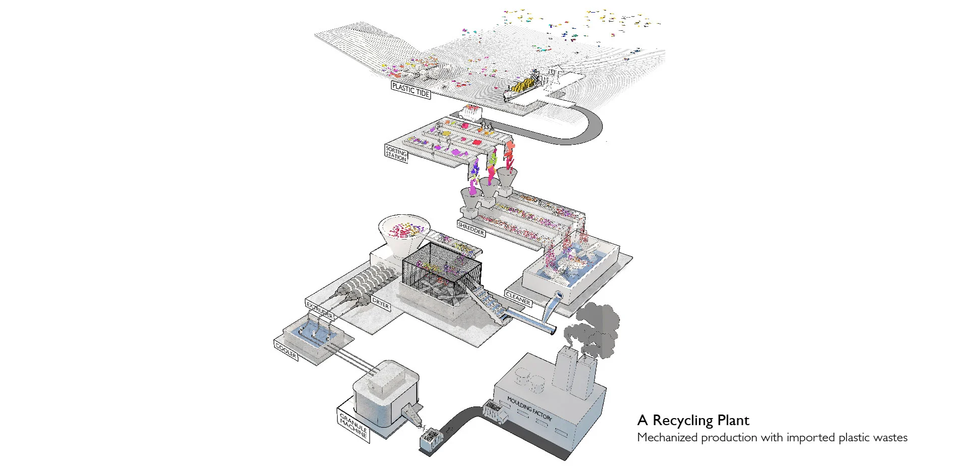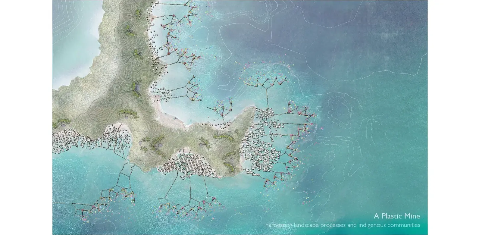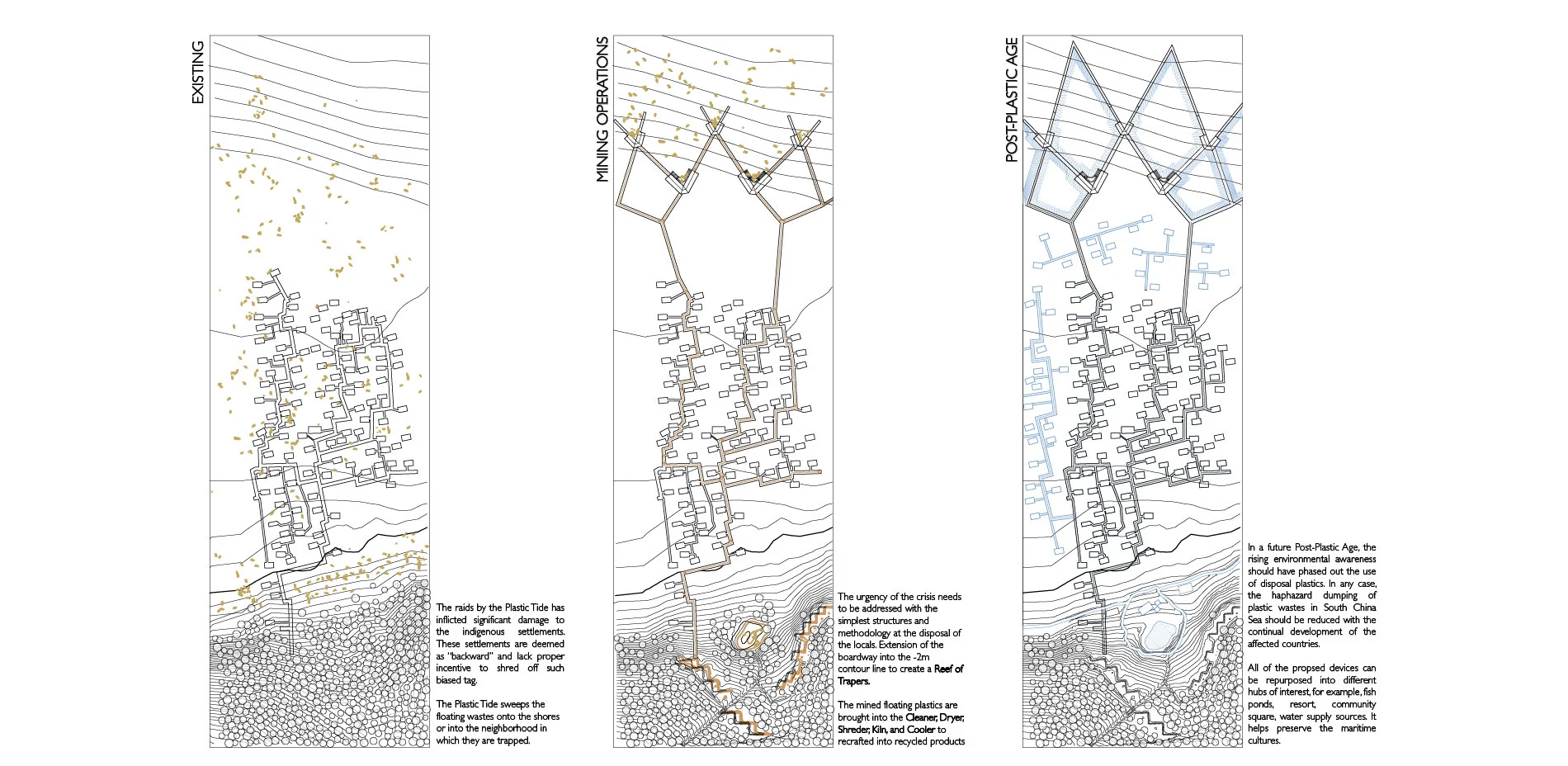 The submission intends to revert the situation by empowering the indigenous villages, designing devices and structures to incentivize spontaneous plastic recycle. Through a recent innovation in crafting plastics, the submission proposes that the plastic tides can be mined, shredded, cleaned, dried, baked and cooled in an efficient landscape system.