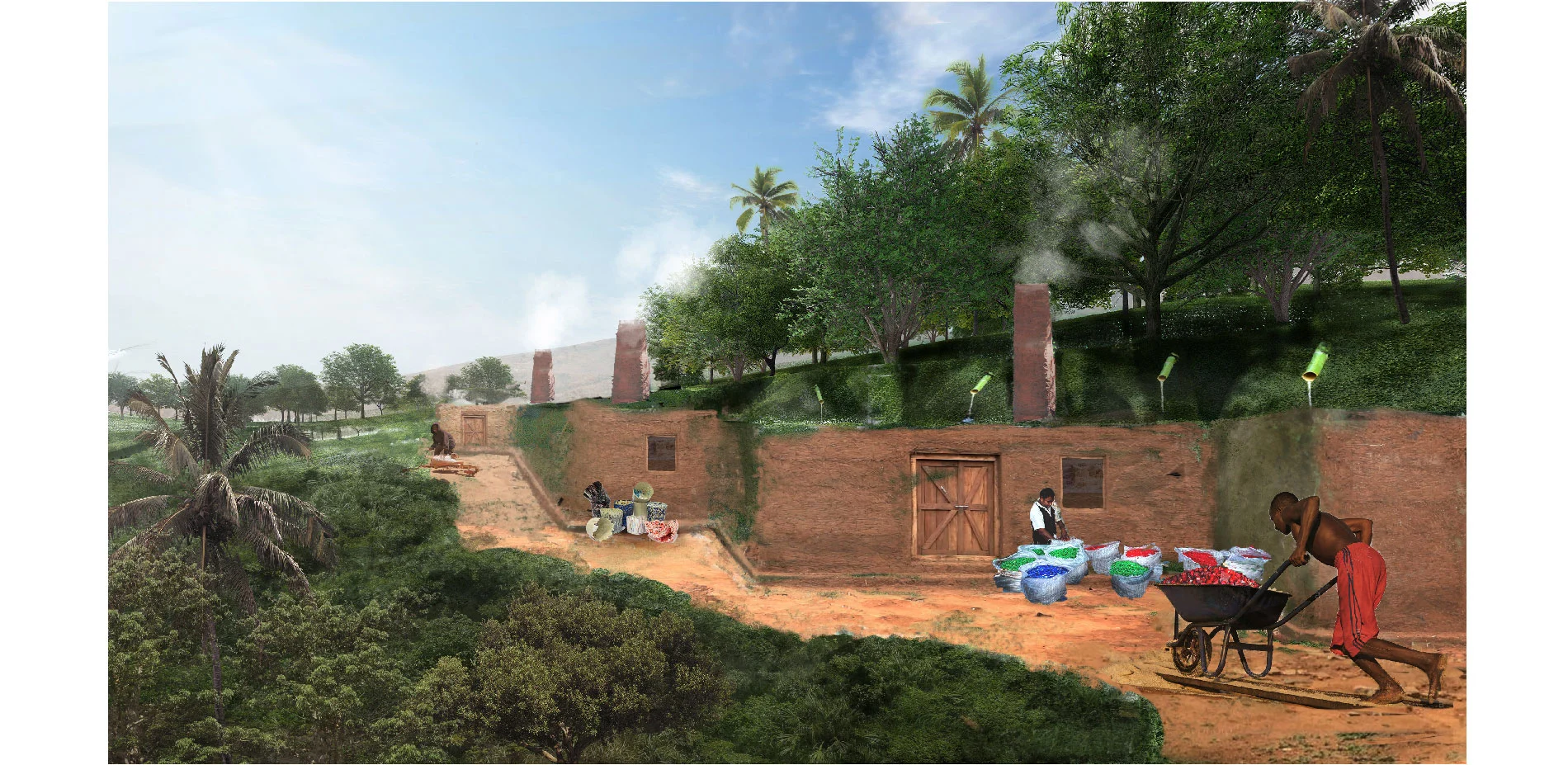 - 90 degree.Melting plastics emits VOCs (Volatile Organic Compounds) which are mildly toxic to human beings. By embedding the kilns in the landscape, it creates a low oxygen environment whereby the VOCs of melting plastics can be minimized. The subterranean kilns are also built by mud wall which is conducive to absorbing the VOC