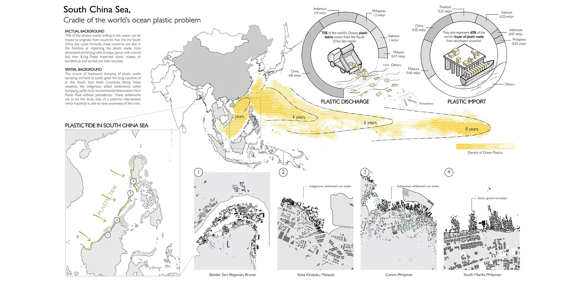 According to a survey done by United Nations, 15 millions tons per year of plastics is haphazardly dumped into the world's ocean. At the current rate, there could be more plastic by weight than fish by 2050. (David Hutt, 2018) The problem is most severe in countries that line the South China Sea, namely China, Indonesia, the Philippines, Thailand, Malaysia and Vietnam, where 75% of the plastics waste drifting in the ocean originates. Much of these floating plastics spend around South China Sea 2 years before drifting out to the ocean. Within these 2 years, the coastal villages are heavily raided by the plastic tides.