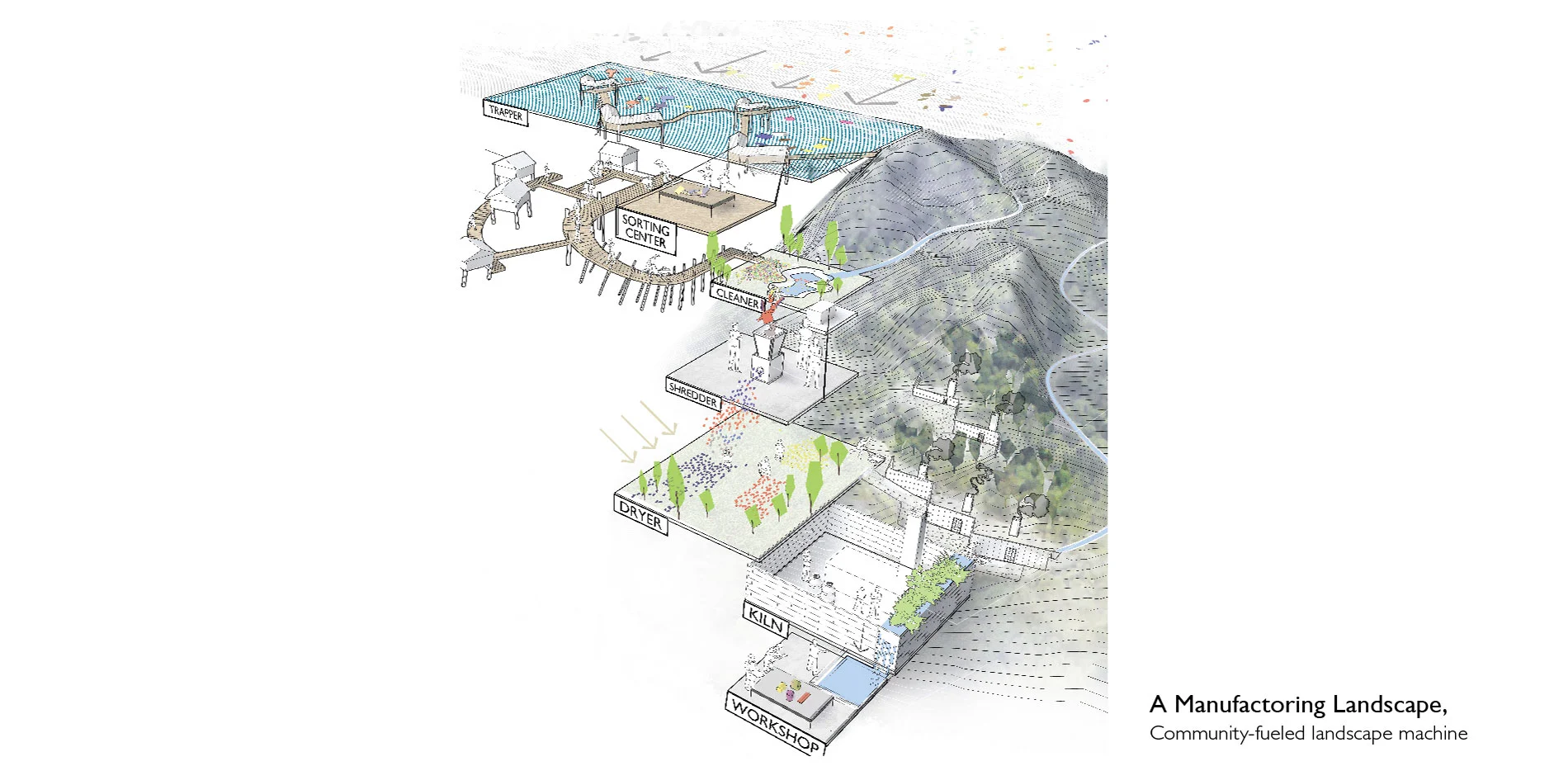 A series of workshops and devices are proposed to be installed in the landscape in an attempt to replicate the processes in the recycling factories, while harnessing the landscape forces to help forge or craft the recycled plastics.