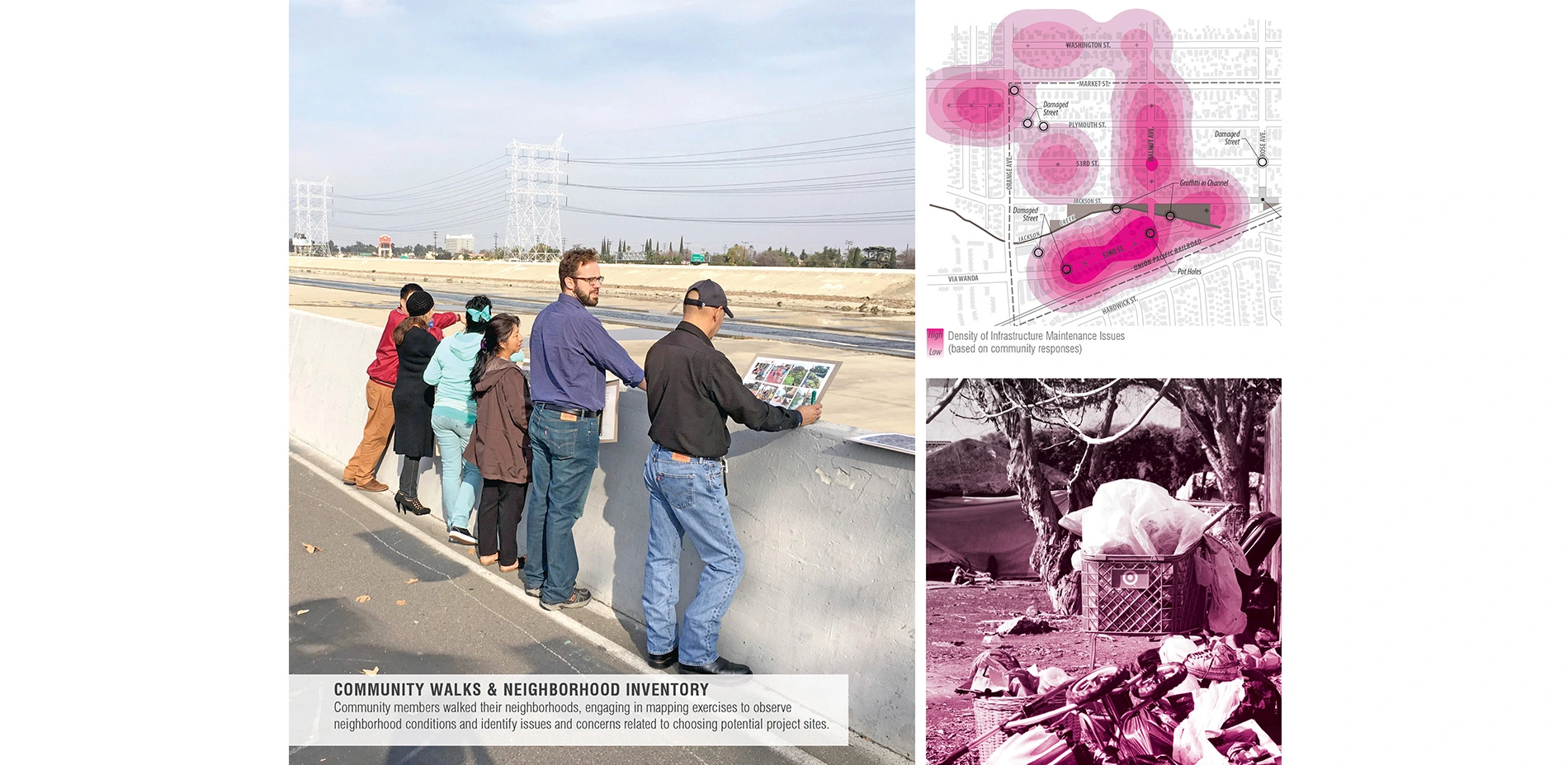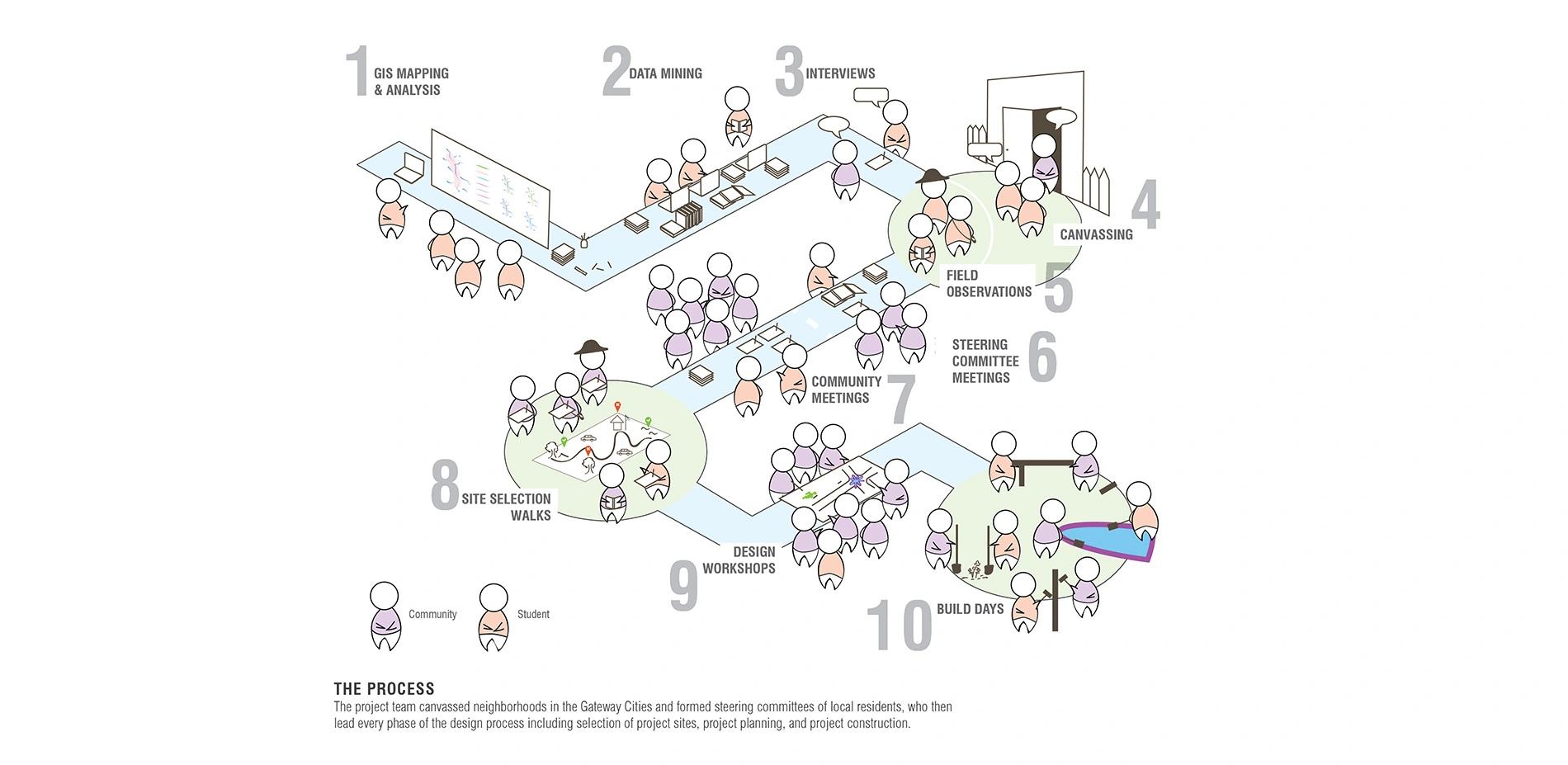 This project focuses on neighborhoods in the Gateway Cities along the Lower Los Angeles River Corridor having denser industrial land-uses, lower median incomes, lower educational attainment, higher population density, more minority residents, and limited access to quality open spaces. The project engaged five different communities over a period of two years. Residents were leaders in all stages of the design-build process from site selection to construction. Project successes include five built projects, a neighborhood advocacy group, and a long-term plan under final design by a local landscape architecture firm. The process demonstrates that simple short-term low-budget projects are effective at engaging communities, empowering residents, and improving neighborhood quality of life. The methods are now being explored by local governmental committees for adoption in State planning processes.